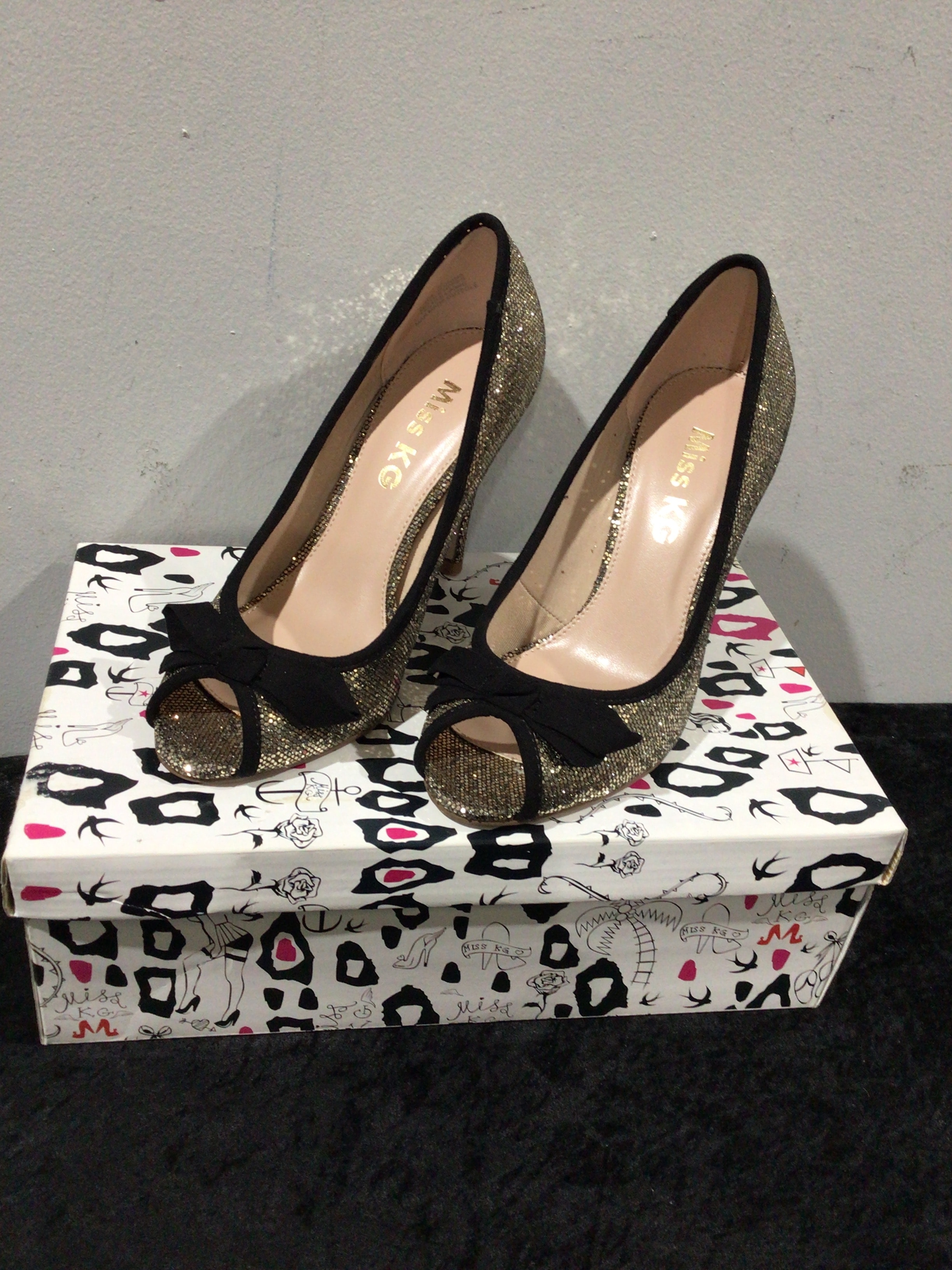 A pair of Miss KG By Kurt Geiger ‘Haversham’ peep-toe stiletto shoes. Crafted in gold-toned glitter material with black trim and a black fabric bow embellishment at the vamp. The interior lining is a light neutral tone, bearing the brand ‘Miss KG’ in gold lettering. The shoes are presented in their original ‘Miss KG’ branded shoebox, featuring a patterned design. An attached label on the box identifies the style as ‘HAVERSHAM’ in ‘GOLD GLITTER’ for ‘Occasion’, specifying size ’36’, a price of ‘£65.00’, and referencing ‘LADIES AW12’ (Autumn/Winter 2012) and ‘WWW.KURTGEIGER.COM’. A sticker on the sole of one shoe additionally indicates ‘SERENA’, ‘BRONZE’, and ‘£59’.