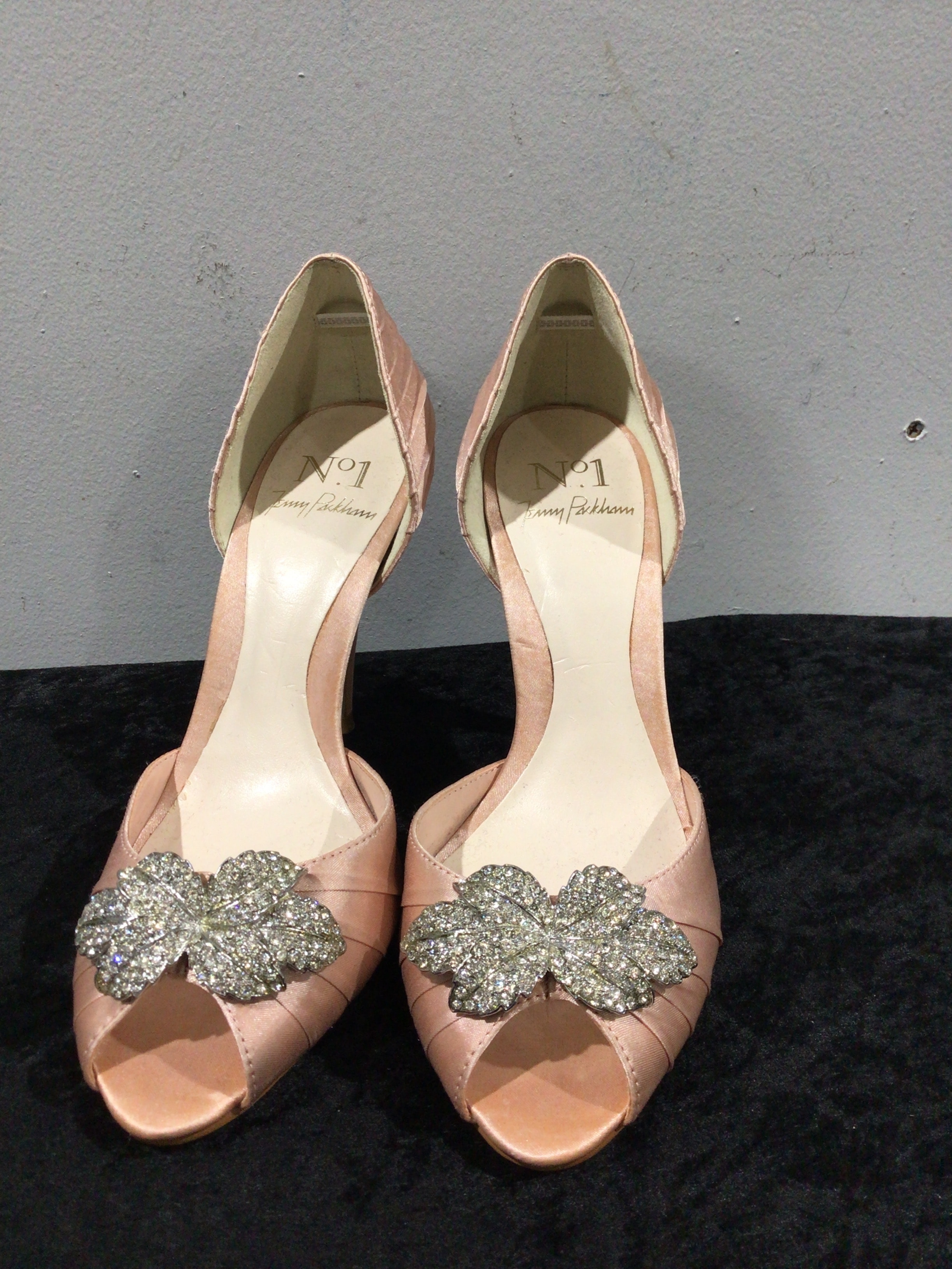 A pair of women’s high-heeled shoes by Jenny Packham, featuring a peep-toe d’Orsay style. The upper is crafted from a satin-like textile in a soft peach-pink hue. Each shoe is adorned with a large, elaborate floral-motif embellishment on the vamp, densely set with clear rhinestones. The interior lining is a synthetic material, marked with “Nº1” and “Jenny Packham” in a script font. The synthetic soles display sizing as “3/36” and include international material symbols indicating a textile upper, synthetic lining, and synthetic sole.