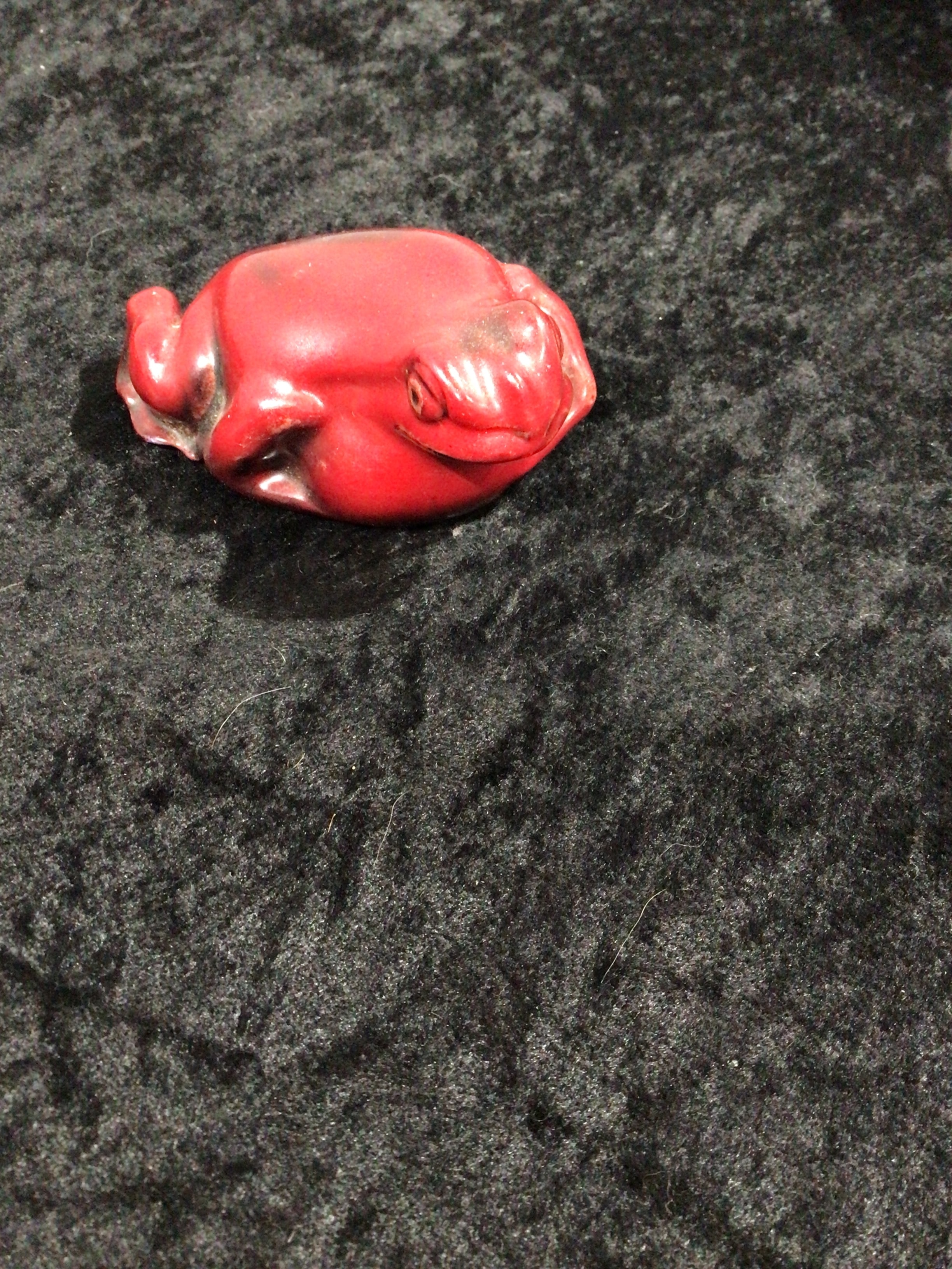A Royal Doulton Flambe ceramic figurine depicting a recumbent frog. The piece is crafted from earthenware and finished with a vibrant, high-gloss red flambe glaze, exhibiting an East Asian aesthetic reminiscent of traditional ‘money frog’ depictions. The underside features a circular hole and is clearly embossed with the numbers “1929”.