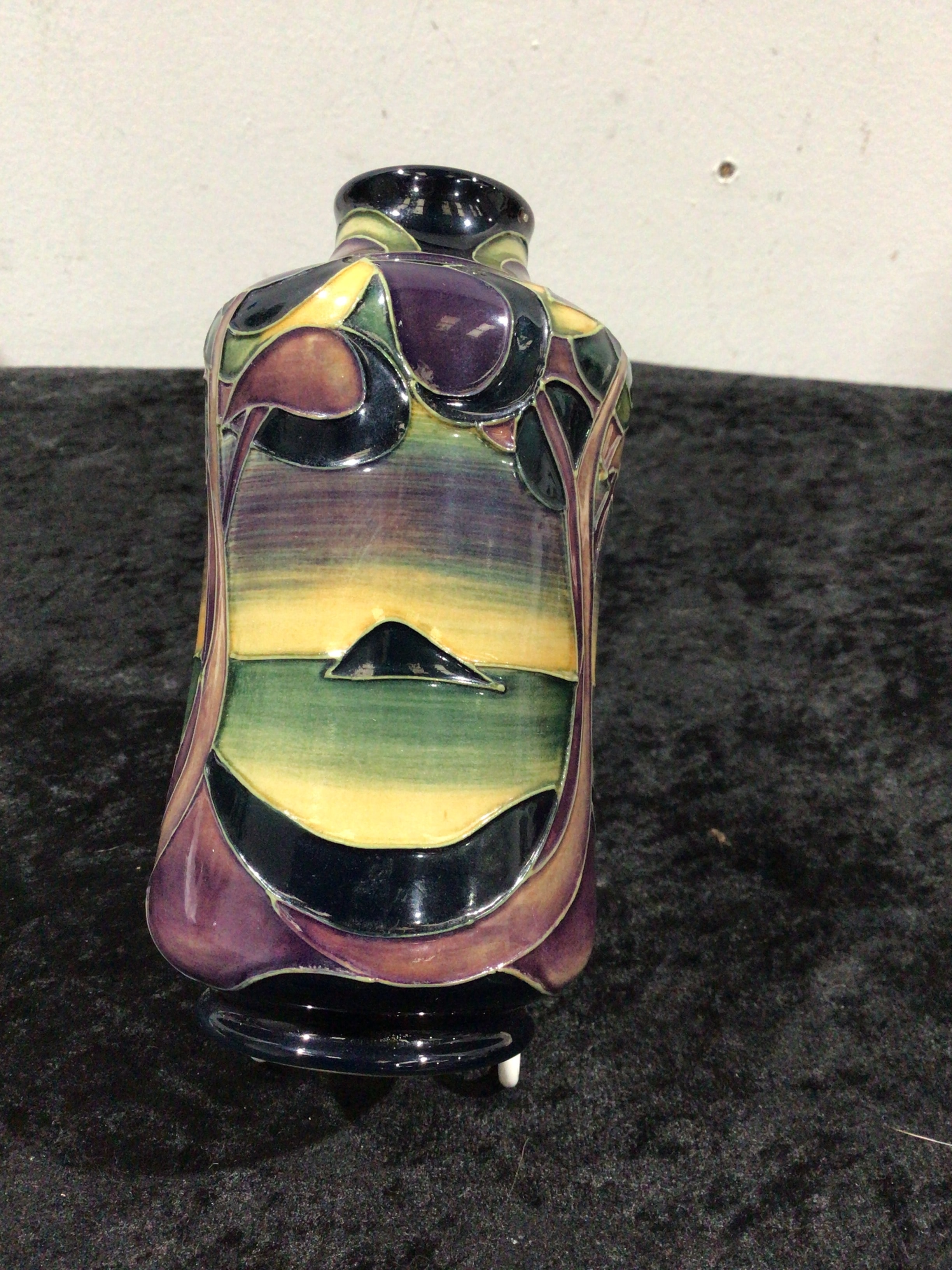 A Moorcroft ‘Western Isles’ pattern vase, designed by Vicky Lovatt, dated 2006. The glazed ceramic vase features a vibrant, stylized landscape design with undulating organic forms resembling trees and a distant island motif, executed in shades of purple, green, yellow, and deep blue. The underside bears clear markings including “MOORCROFT,” “MADE IN ENGLAND,” “STOKE ON TRENT,” a copyright date of “©2006,” and a seahorse symbol, along with additional painted or incised production marks such as “02” and “HB.”