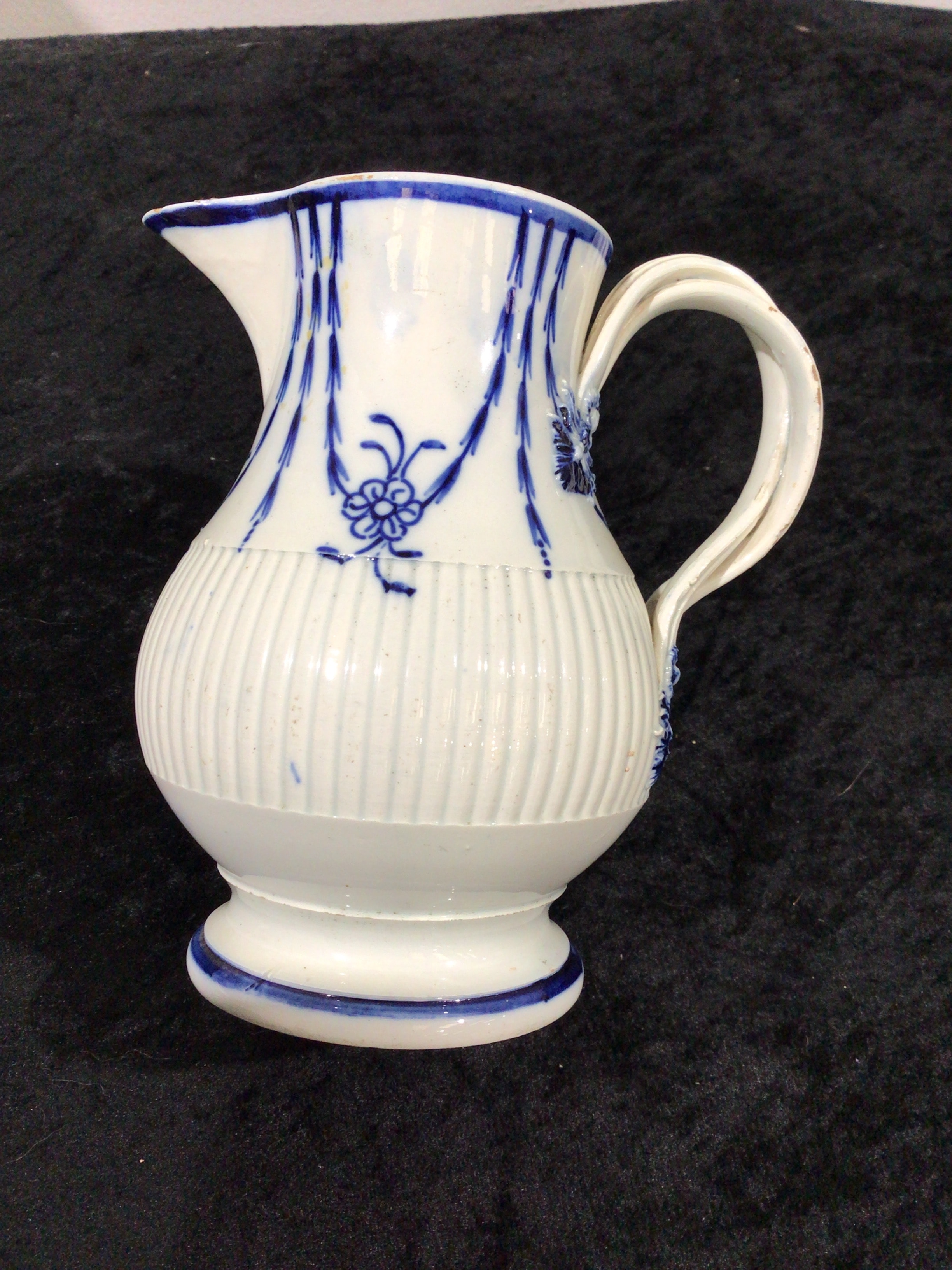 A Leeds Pearlware blue and white jug, circa 1800. The footed white glazed ceramic pitcher features a bulbous, vertically fluted body, a tapering neck with a pouring spout, and an applied, ribbed S-shaped handle. It is decorated with underglaze blue hand-painted motifs, including vertical stylized drapery elements and central floral sprays, complemented by small floral designs at the handle attachments. A handwritten label bearing the text ‘LEEDS’ is visible on the base.