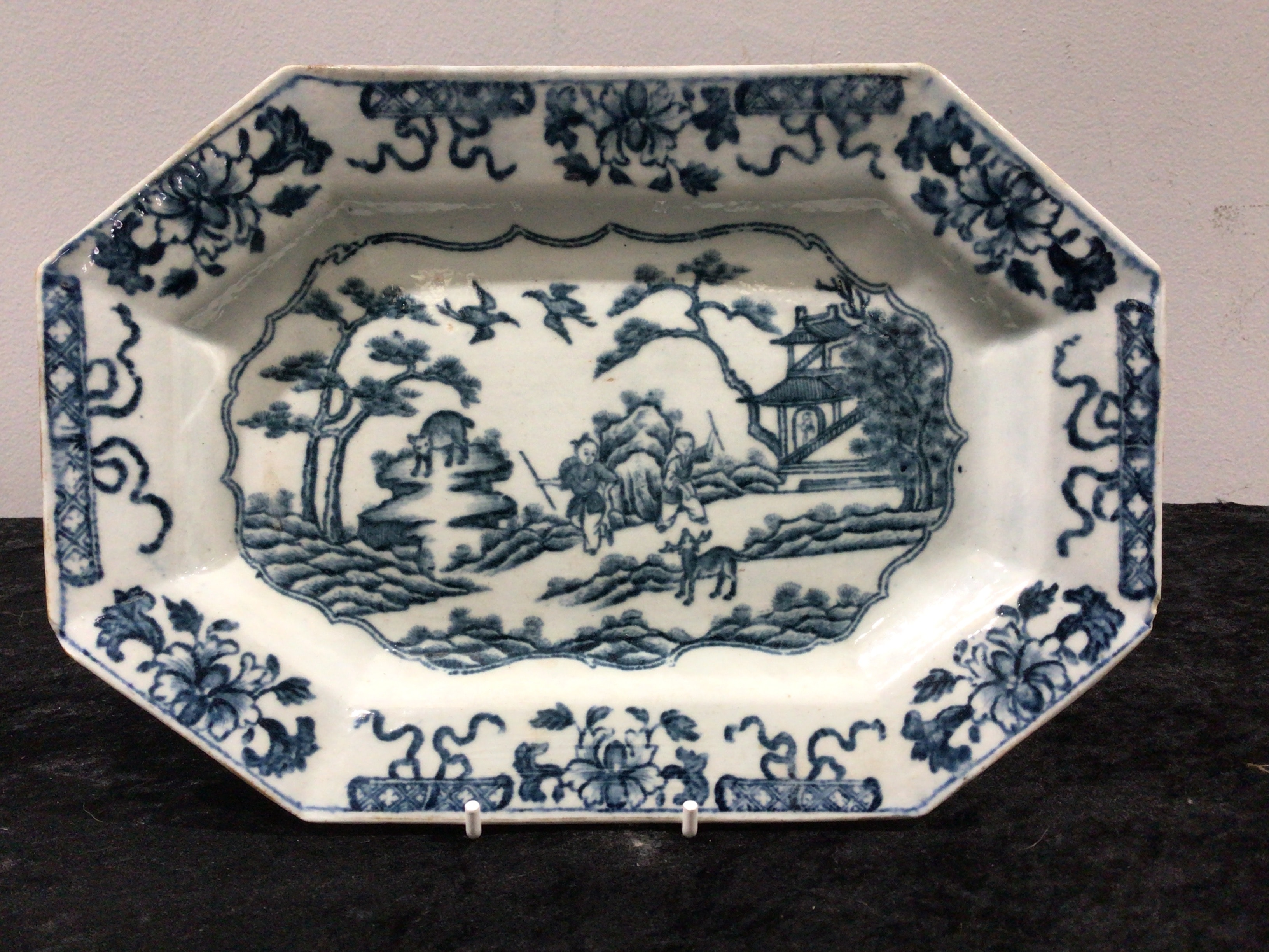 A Liverpool Pennington ‘Fisherman’ Pattern octagonal ceramic dish, circa 1780. Decorated in underglaze blue on a white ground. The central well features an East Asian landscape scene with figures, structures, trees, and birds, framed by a wavy cartouche. The broad rim is adorned with scrollwork and floral motifs. The unglazed reverse has a speckled appearance and bears two affixed labels: a circular paper label reading “RARE LIVERPOOL PENNINGTON” and a second label inscribed with “£895 C1780”.