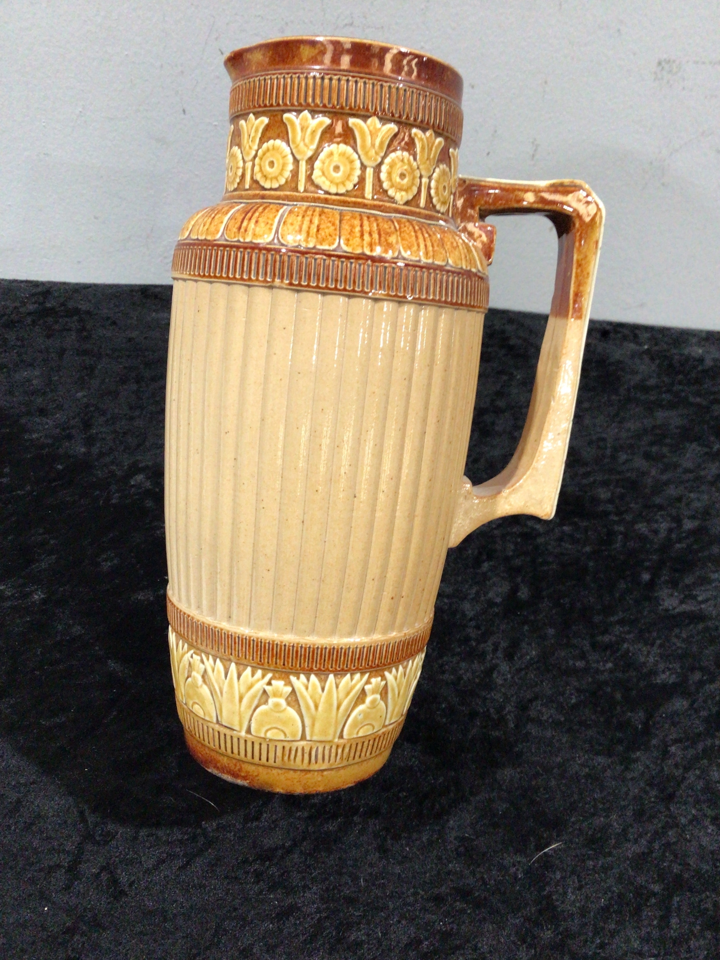 A Royal Doulton Art Nouveau Floral Stoneware Jug. This tall, handled ceramic jug features a predominantly beige body with vertical fluting, accented by decorative bands of impressed floral and foliate motifs rendered in contrasting dark brown and tan glazes around the neck and base. The top rim and handle are also dark brown. The underside bears an impressed British Registry Mark, including ‘3 O 8 G’, dating the piece to 1887, along with an additional impressed ’38’ or ’88’ and faint partial lettering, likely ‘ENGLAND’.