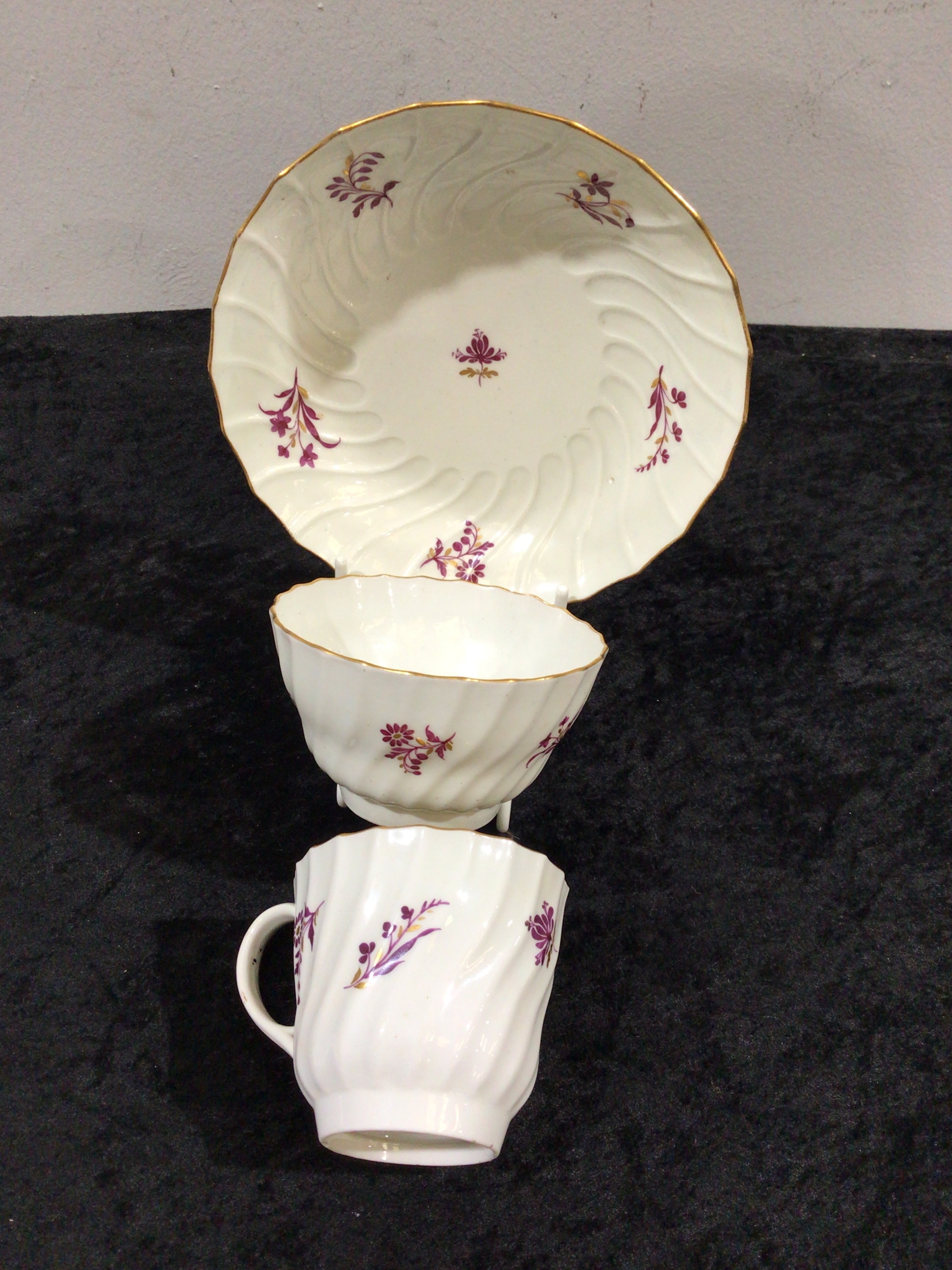 A Flight and Barr Worcester porcelain tea trio, dating to the late 18th century (circa 1783-1792). The set comprises a scalloped-rimmed plate/saucer with a subtle wavy relief texture, a small fluted bowl, and a handled teacup featuring a similar fluted or swirled body. Each piece is decorated with delicate, hand-painted floral sprigs in a deep magenta/purple hue accented with gilt details, and all rims are finished with gold banding. The style is characterized by its rococo-influenced fluting and scalloping with sparse floral decoration and gilding. No manufacturer’s marks or text are visible on the undersides of the items.