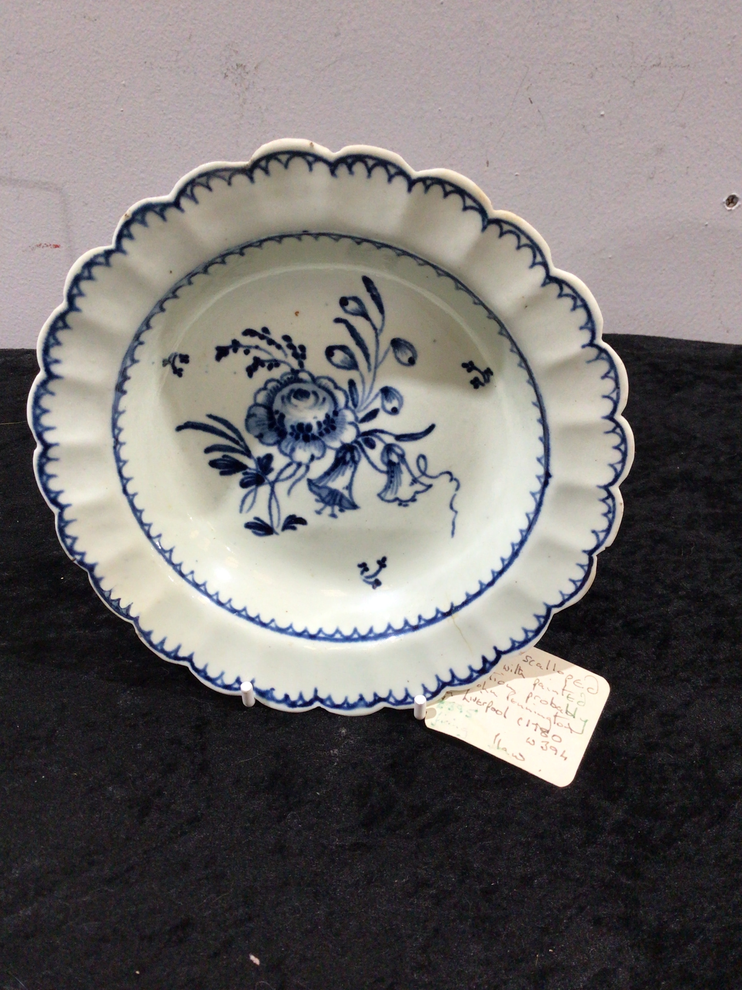 A Liverpool Pearlware Plate, dating to circa 1780. This glazed ceramic plate or shallow bowl features a scalloped, moulded rim and is decorated in underglaze blue. The central decoration comprises a stylized floral arrangement with a prominent rose-like bloom, smaller bell-shaped flowers, and foliage, accented by scattered smaller sprigs within the well. A simple blue line follows the contours of the scalloped rim. The item bears an attached handwritten tag indicating “No. 394.”