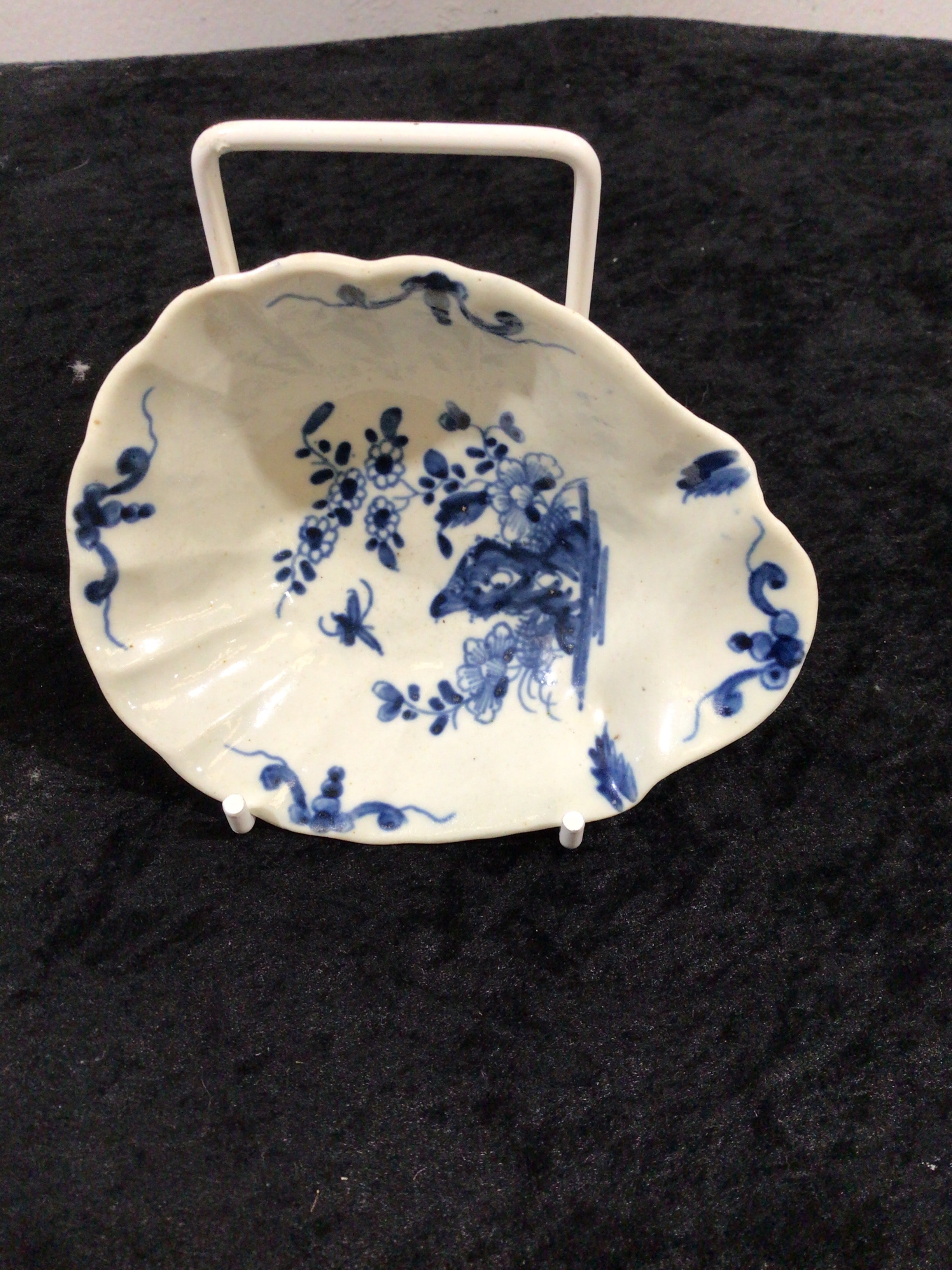 An 18th Century Worcester porcelain pickle dish, of irregular, organic form with an undulating rim. The dish is decorated in underglaze blue and white with botanical motifs, including flowering branches and a butterfly or insect, bordered by delicate scrollwork on the rim. The underside features an elongated oval footrim and subtle fluting. A faint, illegible mark is present within the footrim area.