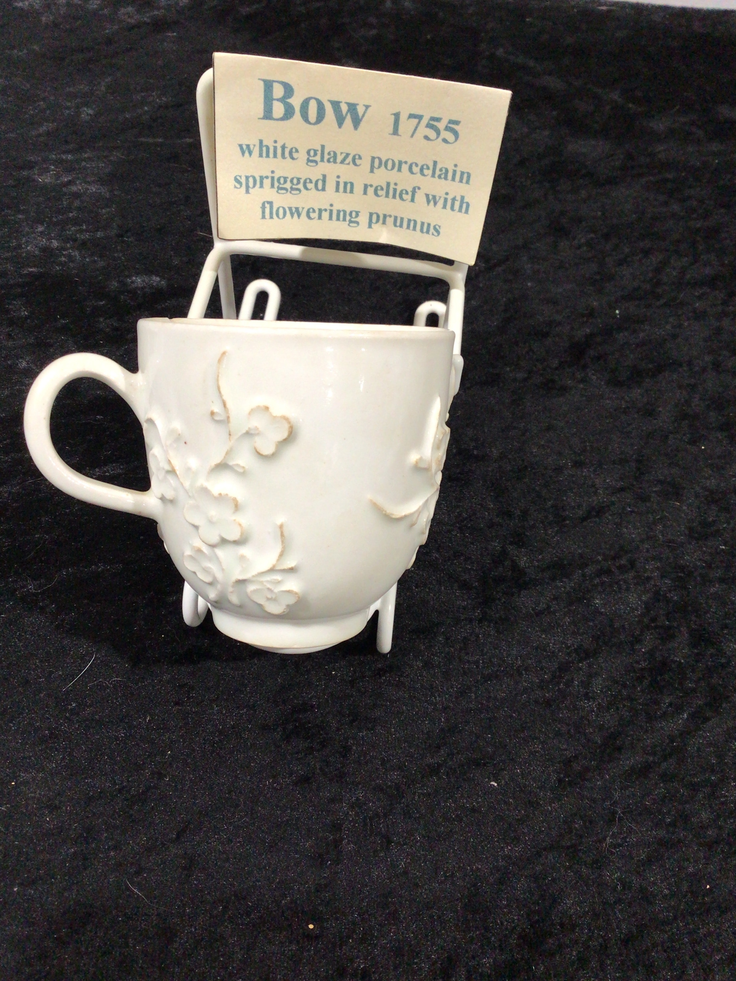 A Bow white glaze porcelain cup, dated 1755. The footed cup features a simple C-scroll handle and is extensively decorated on its exterior with sprigged relief motifs of flowering prunus. An accompanying display label identifies the piece as ‘Bow 1755 / white glaze porcelain / sprigged in relief with / flowering prunus.’