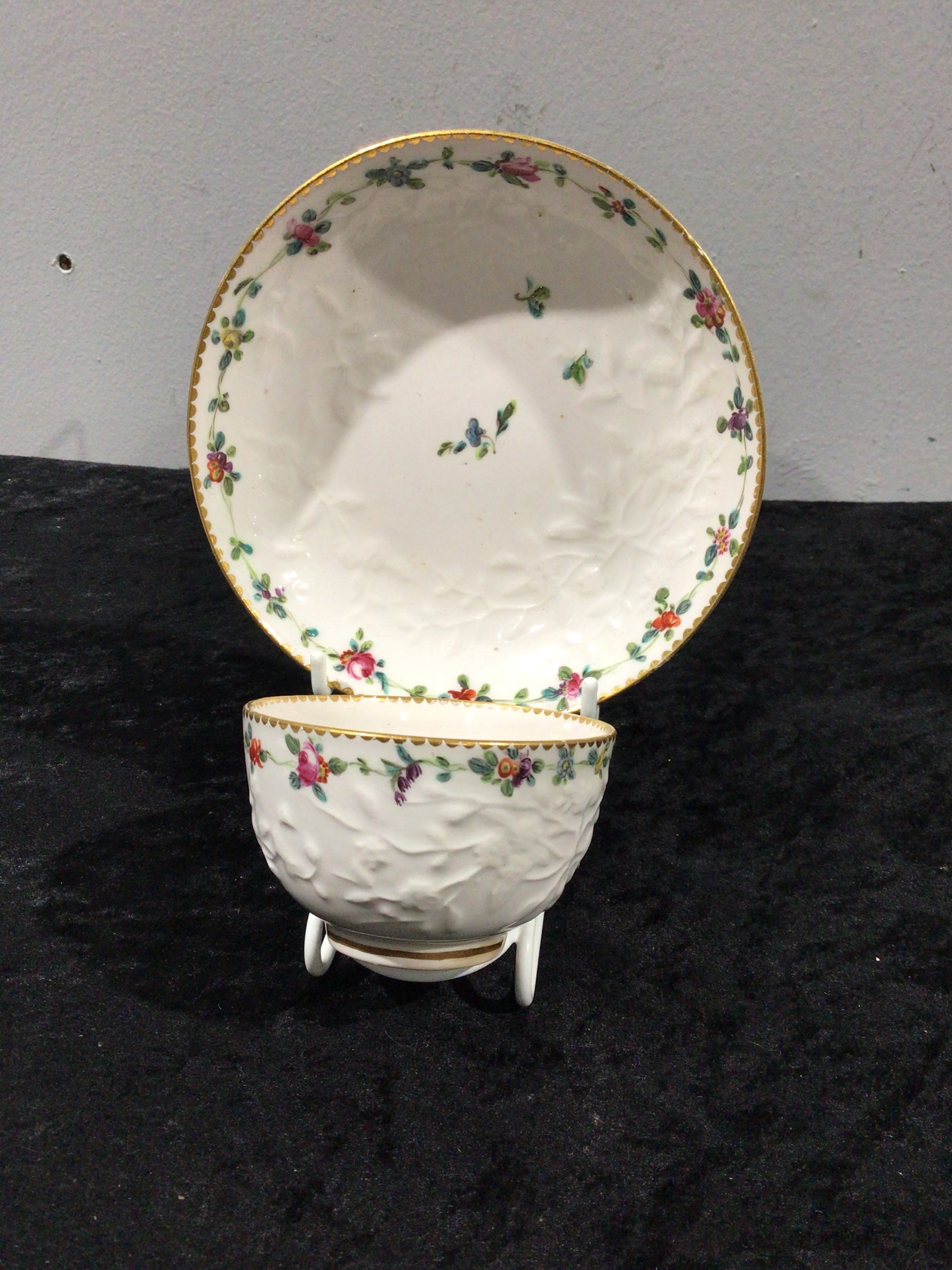 This European porcelain teabowl and saucer set, attributed to the Swiss Nyon Factory and dating to the 18th century, features a white ground with a subtle molded relief pattern. Both pieces are adorned with hand-painted polychrome floral sprigs and scattered individual flowers, bordered by gilt rims. The footed teabowl also has gilt detailing on its base. The underside of the saucer bears faint handwritten text, possibly “China” or “Chine” with numbers. The underside of the teabowl displays a distinct blue underglaze mark resembling a stylized anchor or complex monogram, consistent with Nyon production.