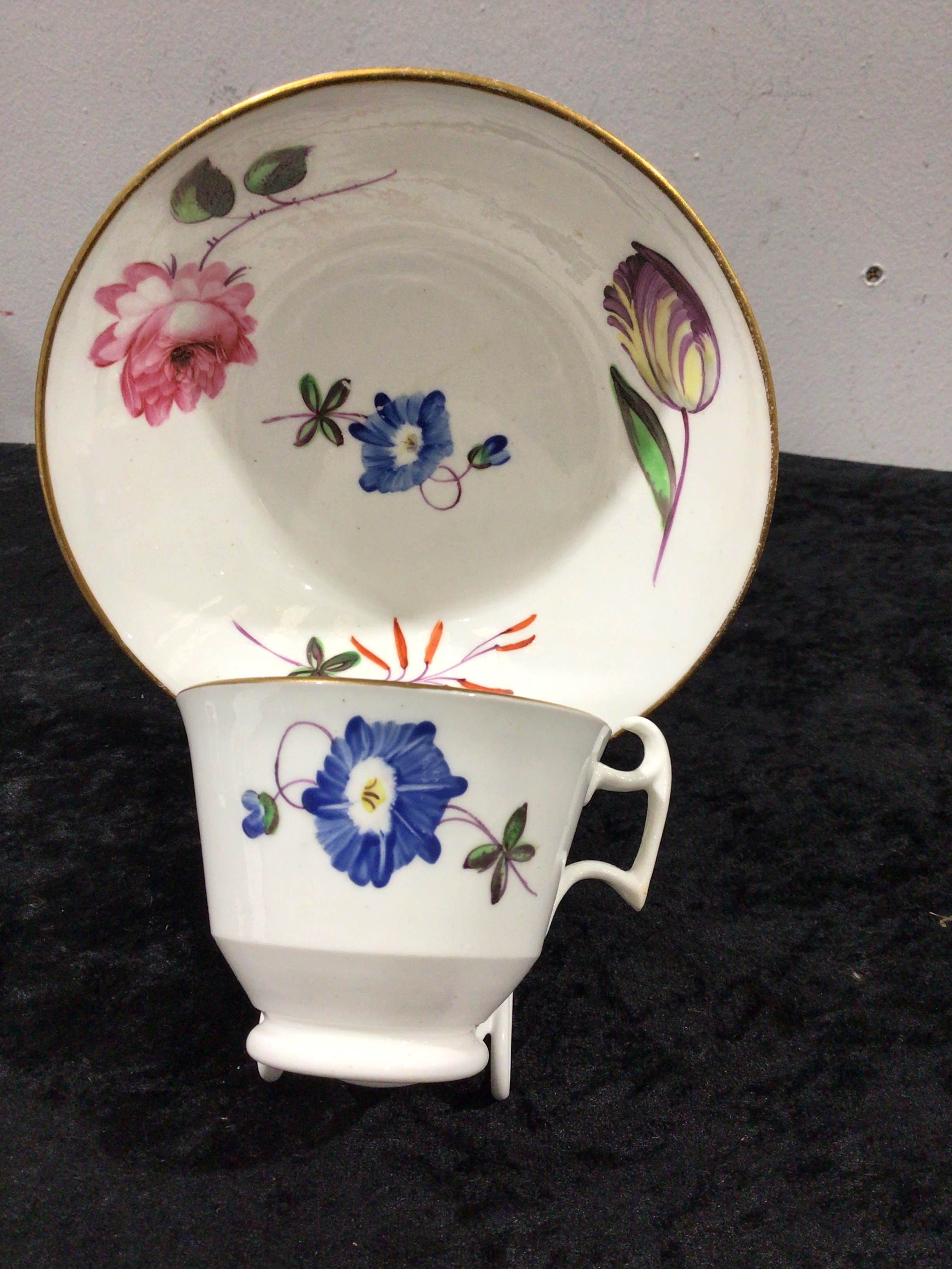 A white porcelain or fine china teacup and saucer set, featuring an antique aesthetic. Both pieces are hand-painted with polychrome floral motifs, including roses, tulips, and smaller blue blossoms. The decoration extends to the interior of the cup. Both the cup and saucer are accented with gold-gilt rims. Circa 1770-75