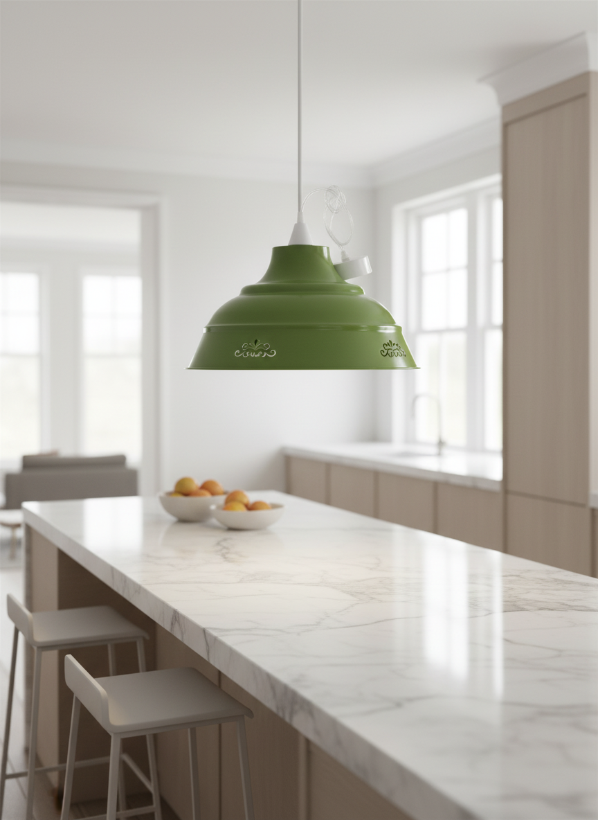 A pair of glossy green metal pendant lampshades with white electrical components and black decorative scrollwork cut-outs, in an industrial farmhouse style.