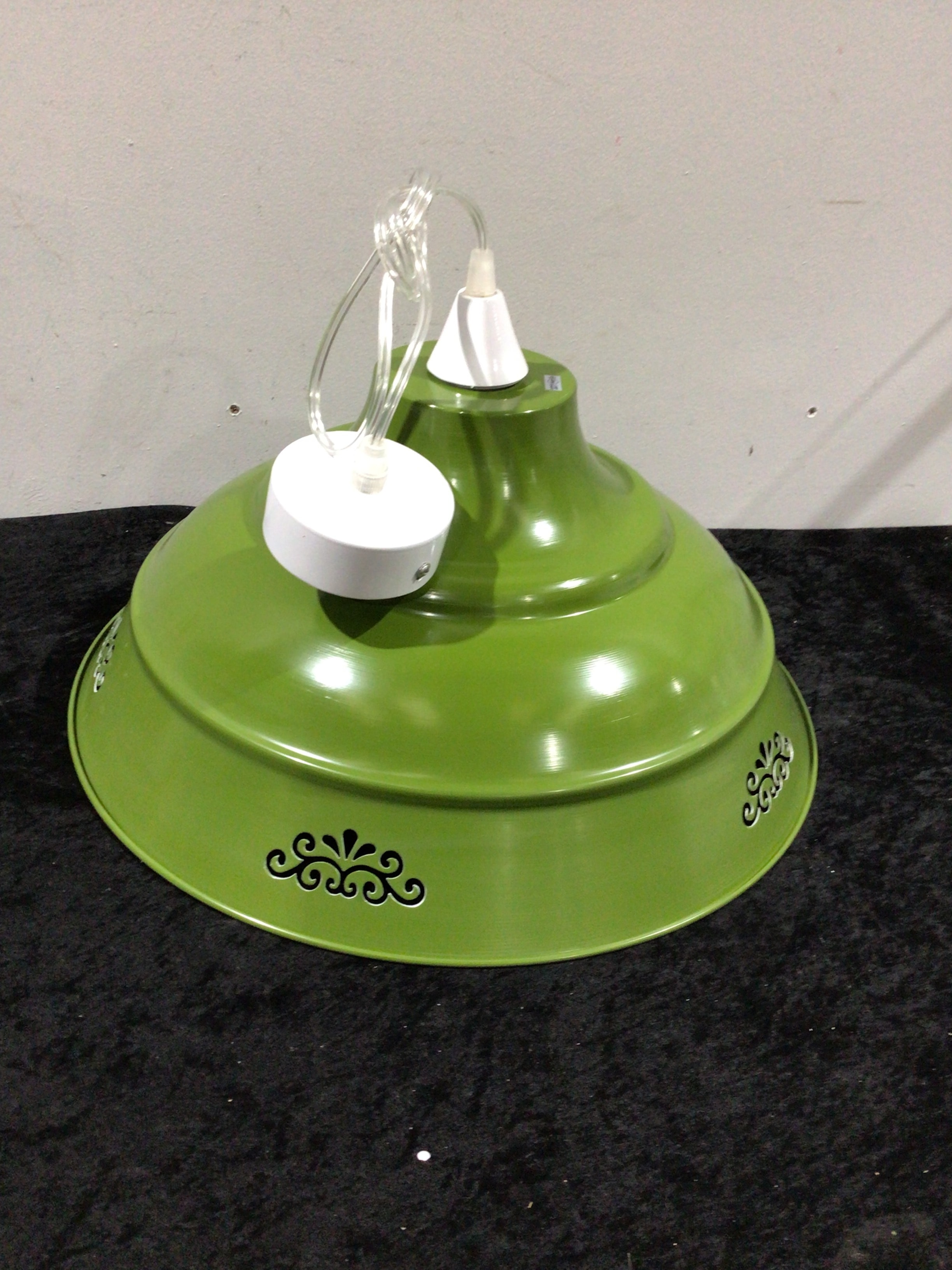 A 1 green metal pendant light fixture with white fittings and clear cords, featuring decorative cut-outs around the rim.