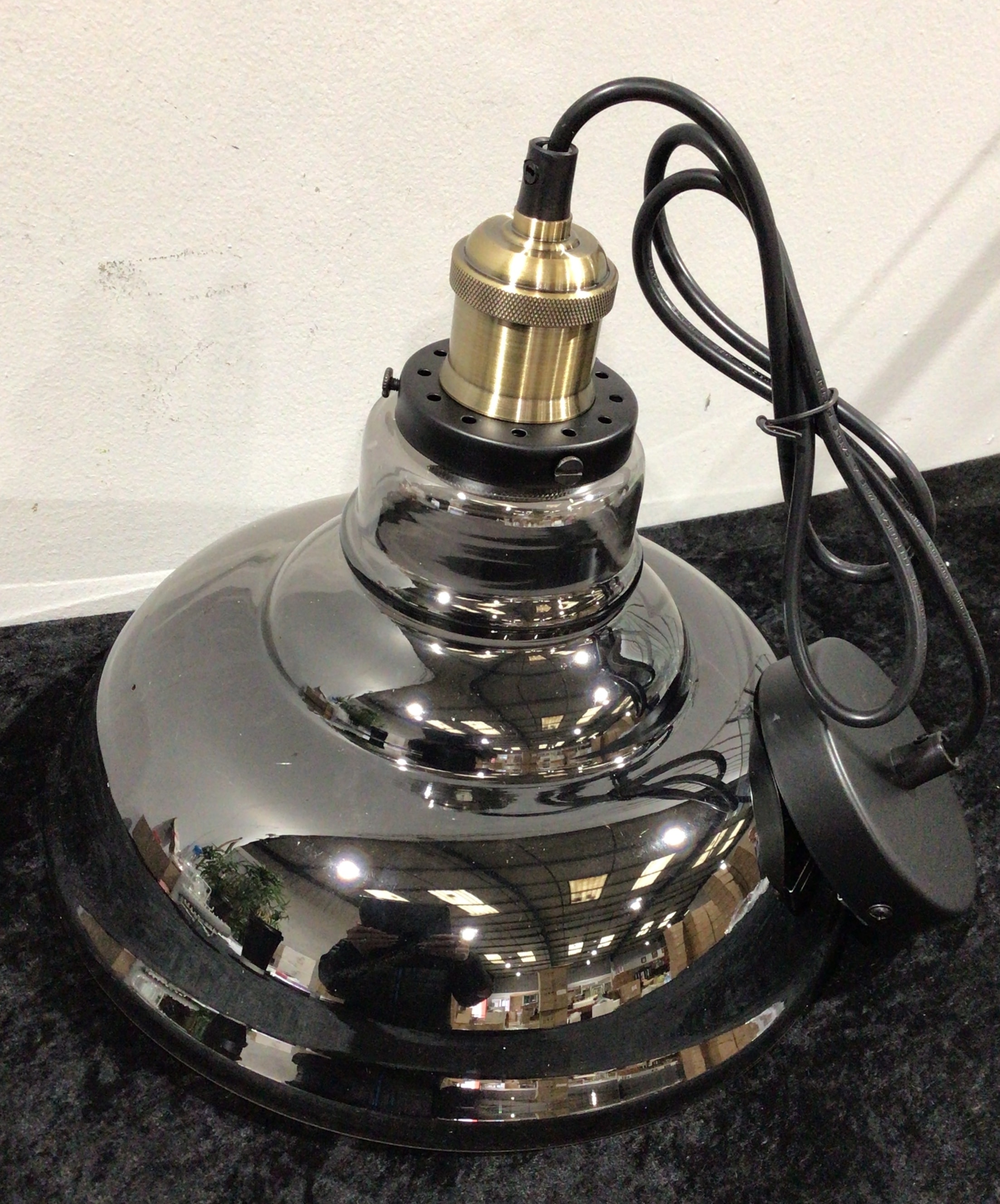 A round pendant light fixture features a reflective dark grey/smoked glass or chrome shade, a brass-colored E27 lamp holder, black electrical cord, and matching black ceiling rose.