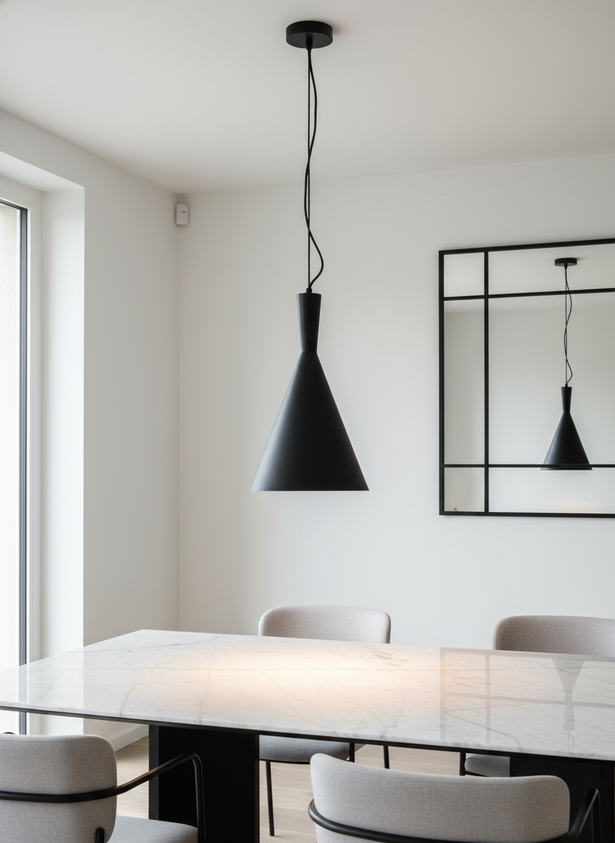 A single matte black cone-shaped pendant light fixture features a hammered gold-colored interior.