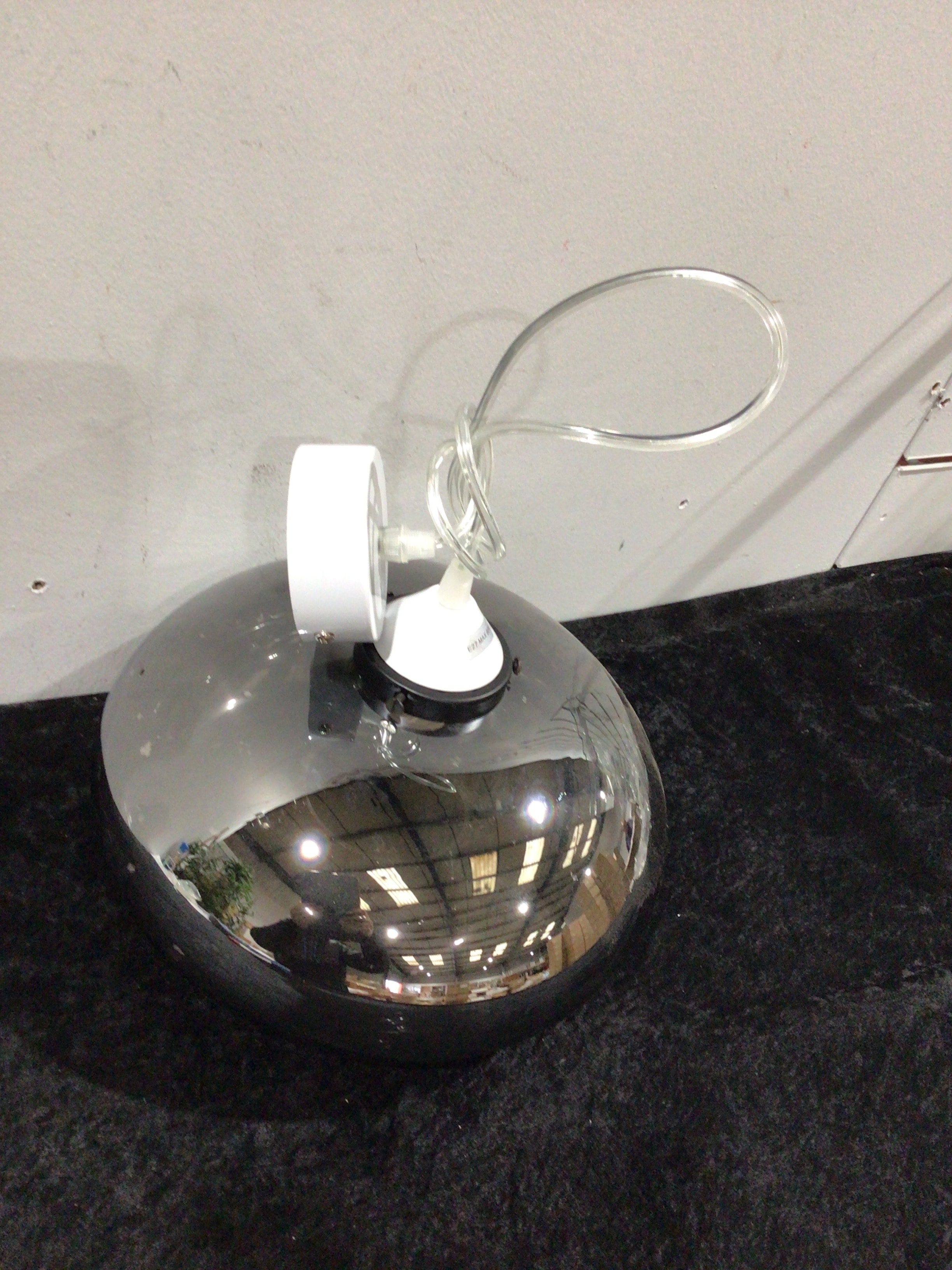 A modernist chrome reflective pendant light fixture with white mounting hardware, inscribed ‘E27 MAX’.