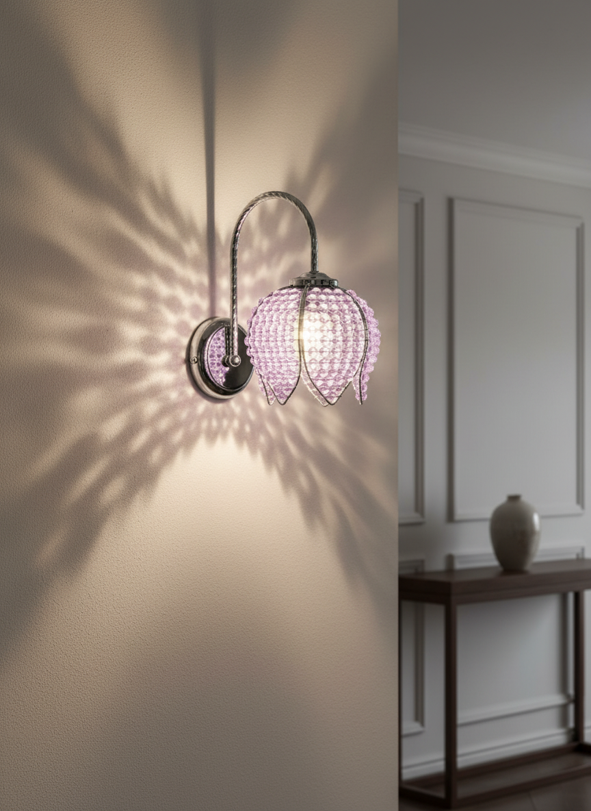 Four wall-mounted light fixtures with silver-tone/chrome curved arms and bases, featuring shades composed of clear purple faceted beads.