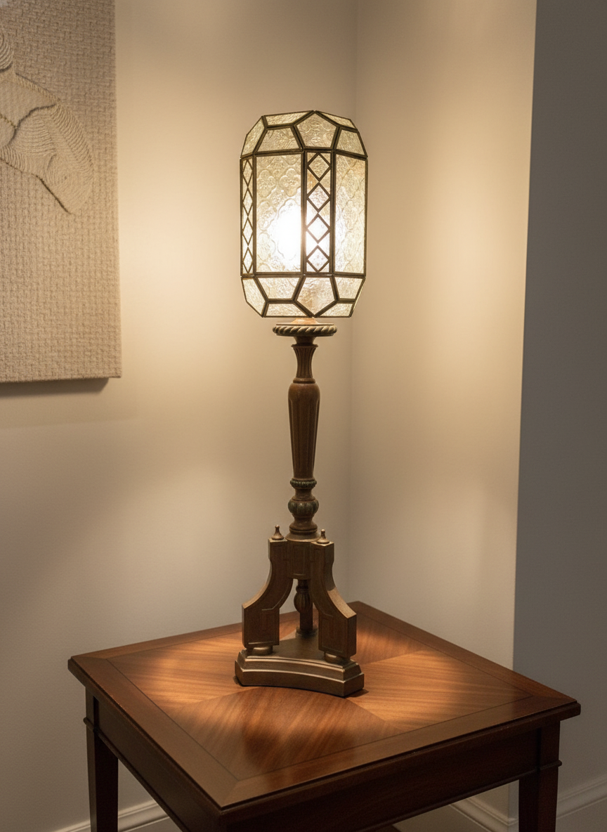 A single ornate Table lamp features a hexagonal lantern-style head with brass-toned metal framing and textured clear glass panels, atop an elaborate bronzed/coppery-brown metal stand, with electrical components at its base.