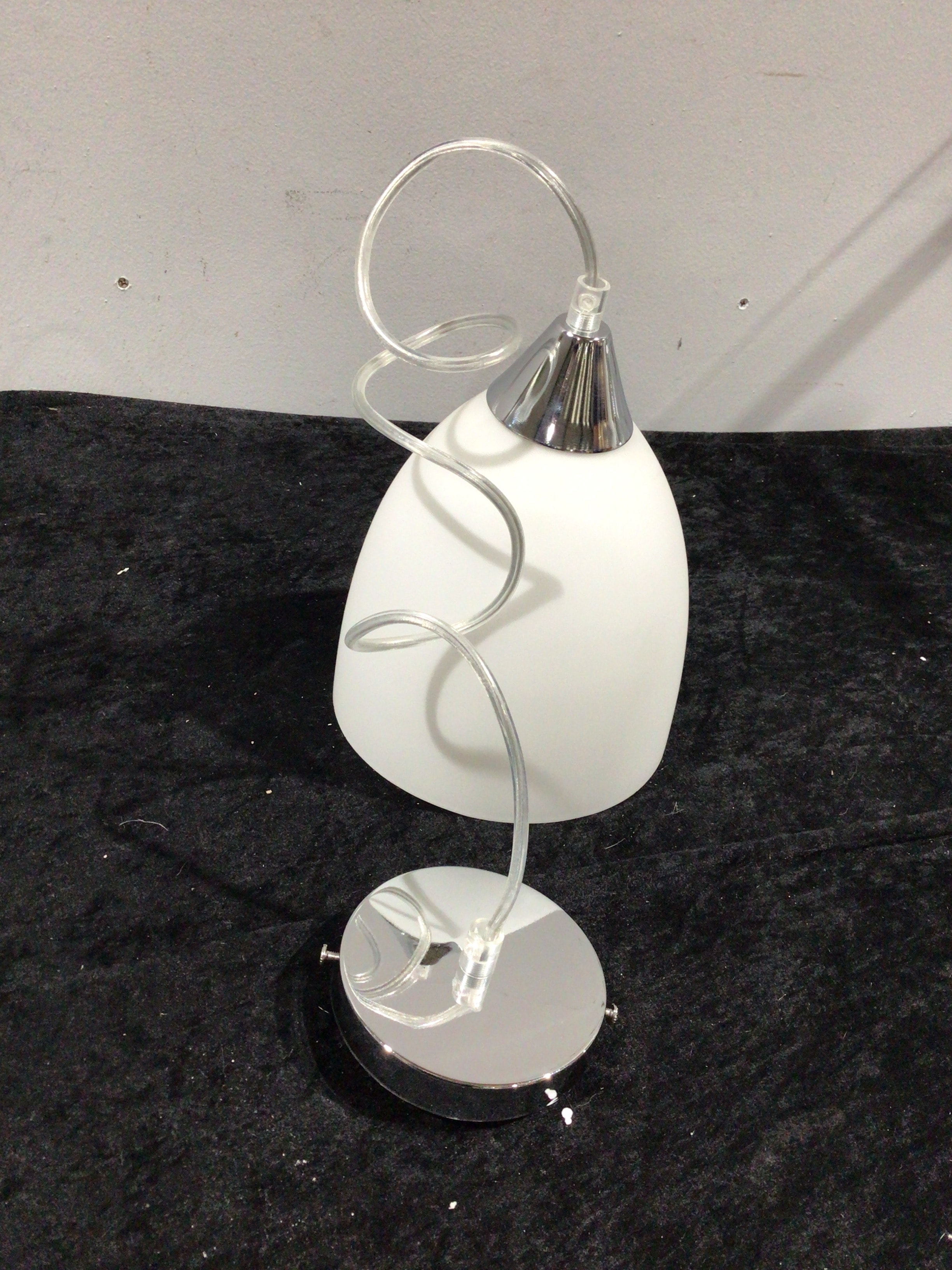 A modern pendant light fixture with a frosted white glass shade, chrome-plated metal components, and a clear spiraled cord.