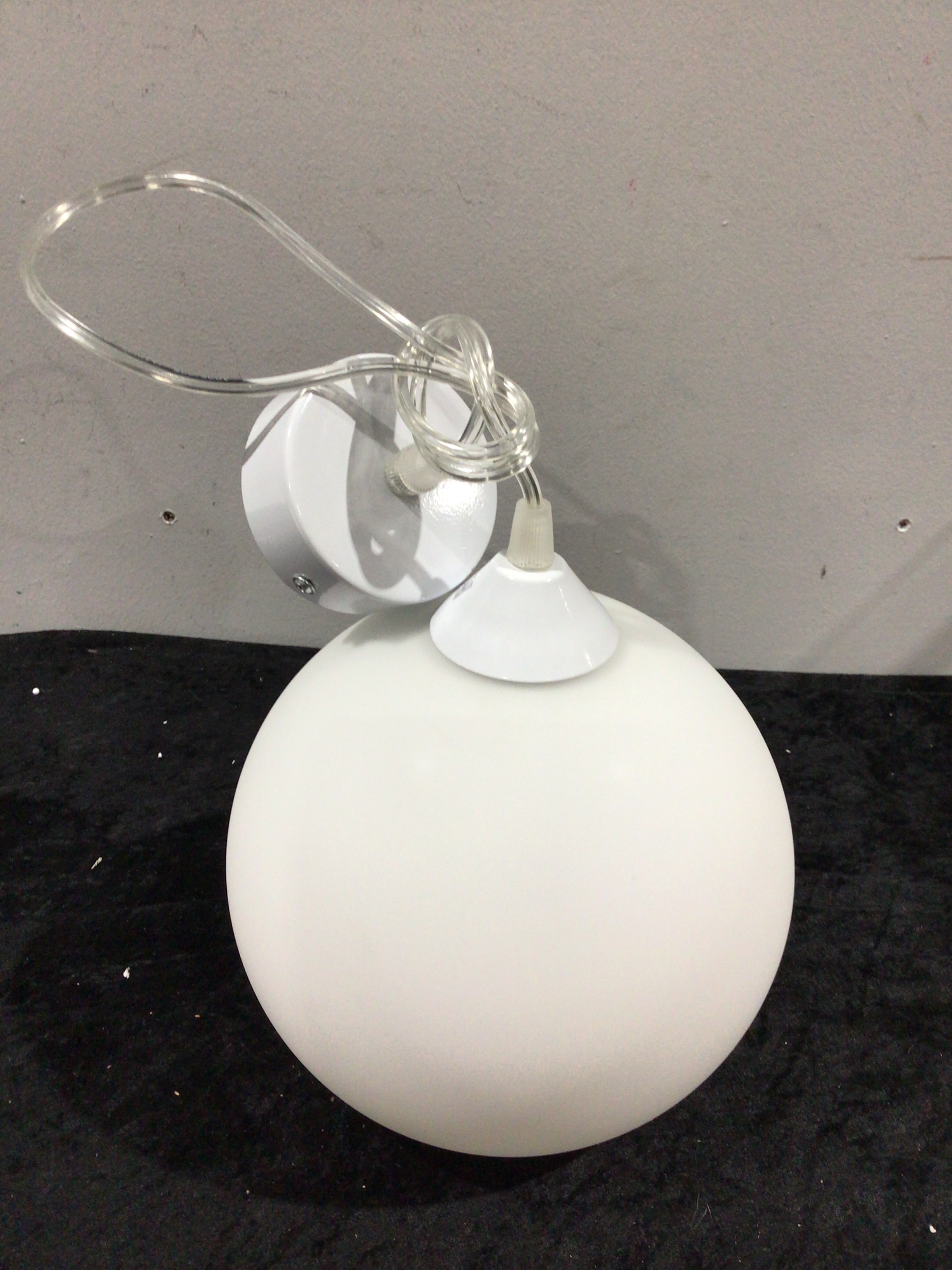 A white spherical pendant light fixture with a clear electrical cord and white ceiling rose.