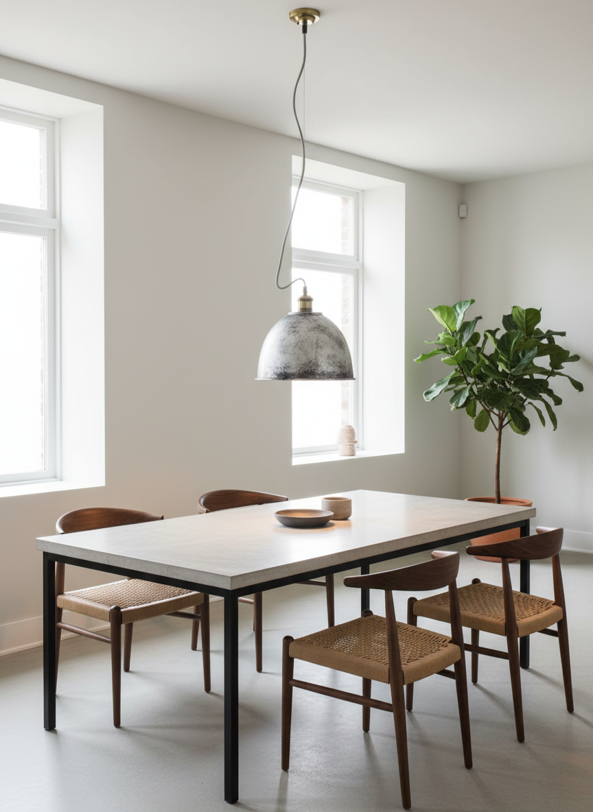 A distressed silver/grey dome-shaped barn style pendant light fixture with a brass-colored fitting and a grey cable.