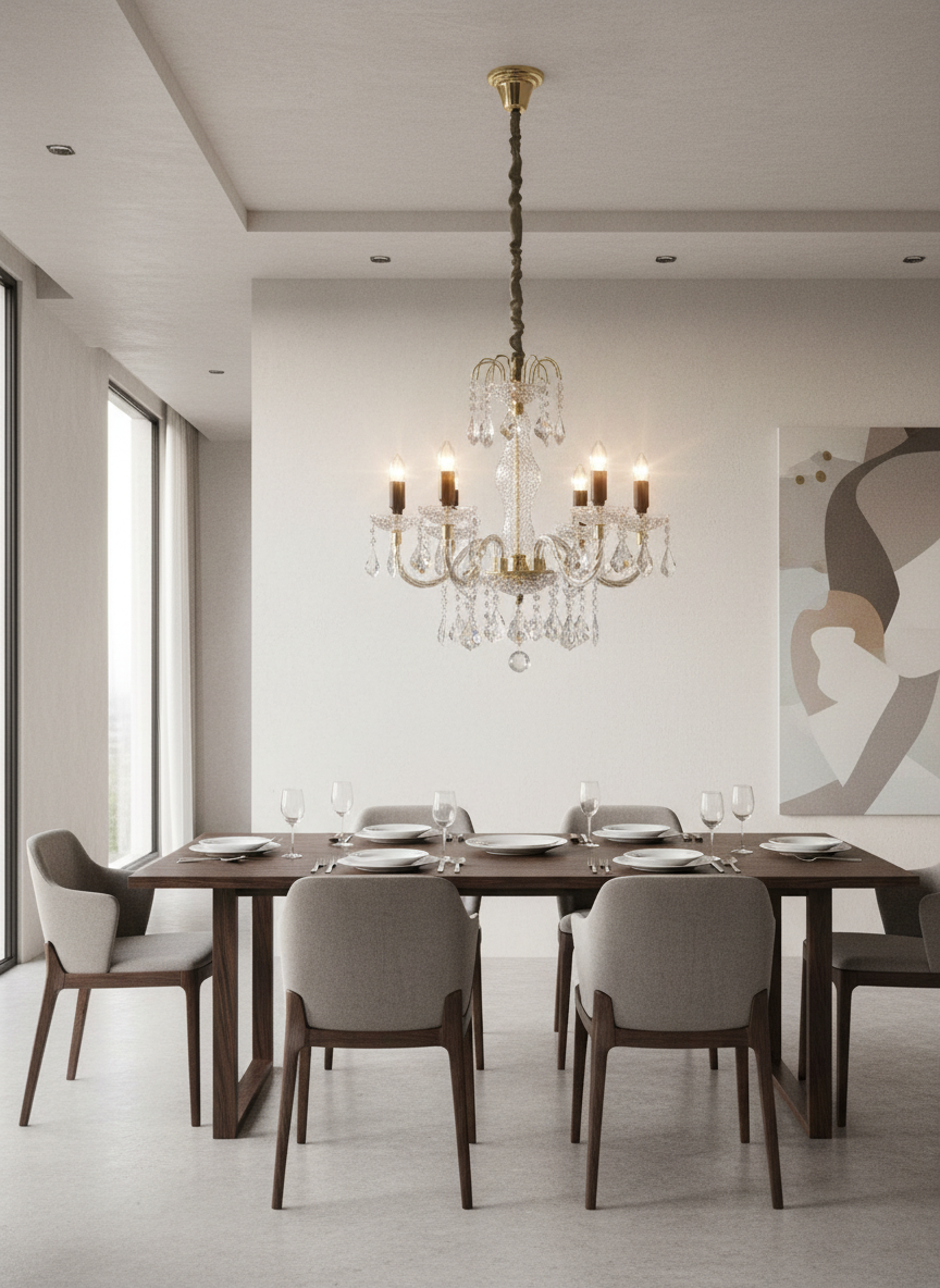 A pair of contemporary traditional style 5-light chandeliers, each featuring gold-tone metal arms and a central base adorned with numerous clear, faceted acrylic elements. The design offers a modern interpretation of classic chandelier aesthetics. The lot comprises components for two such fixtures, largely in their original, partially opened packaging. Visible text on the cardboard box’s label identifies the item as ‘Light Clear Chrome Acrylic’ with model number ‘C708/5’.