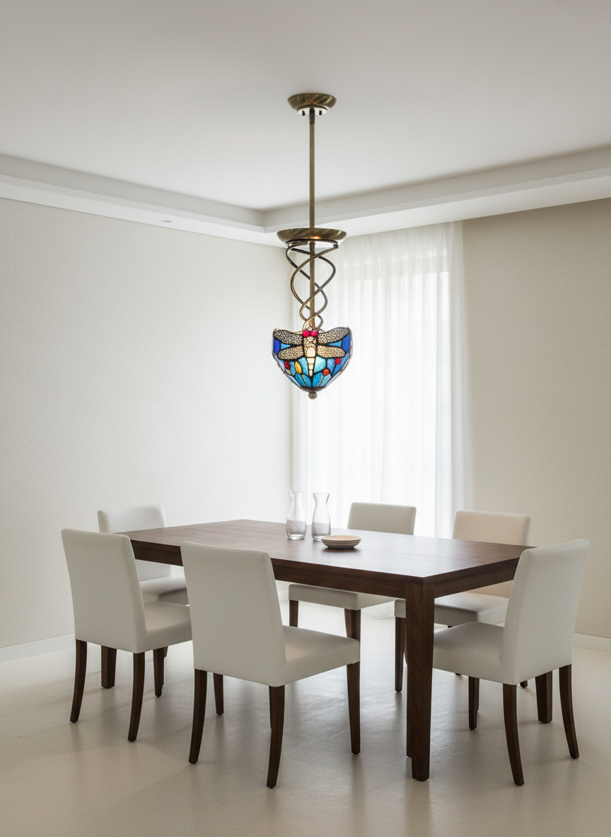 A Tiffany-Style Art Nouveau Leaded Stained Glass Dragonfly Semi-Flush Mount Light Fixture, 1