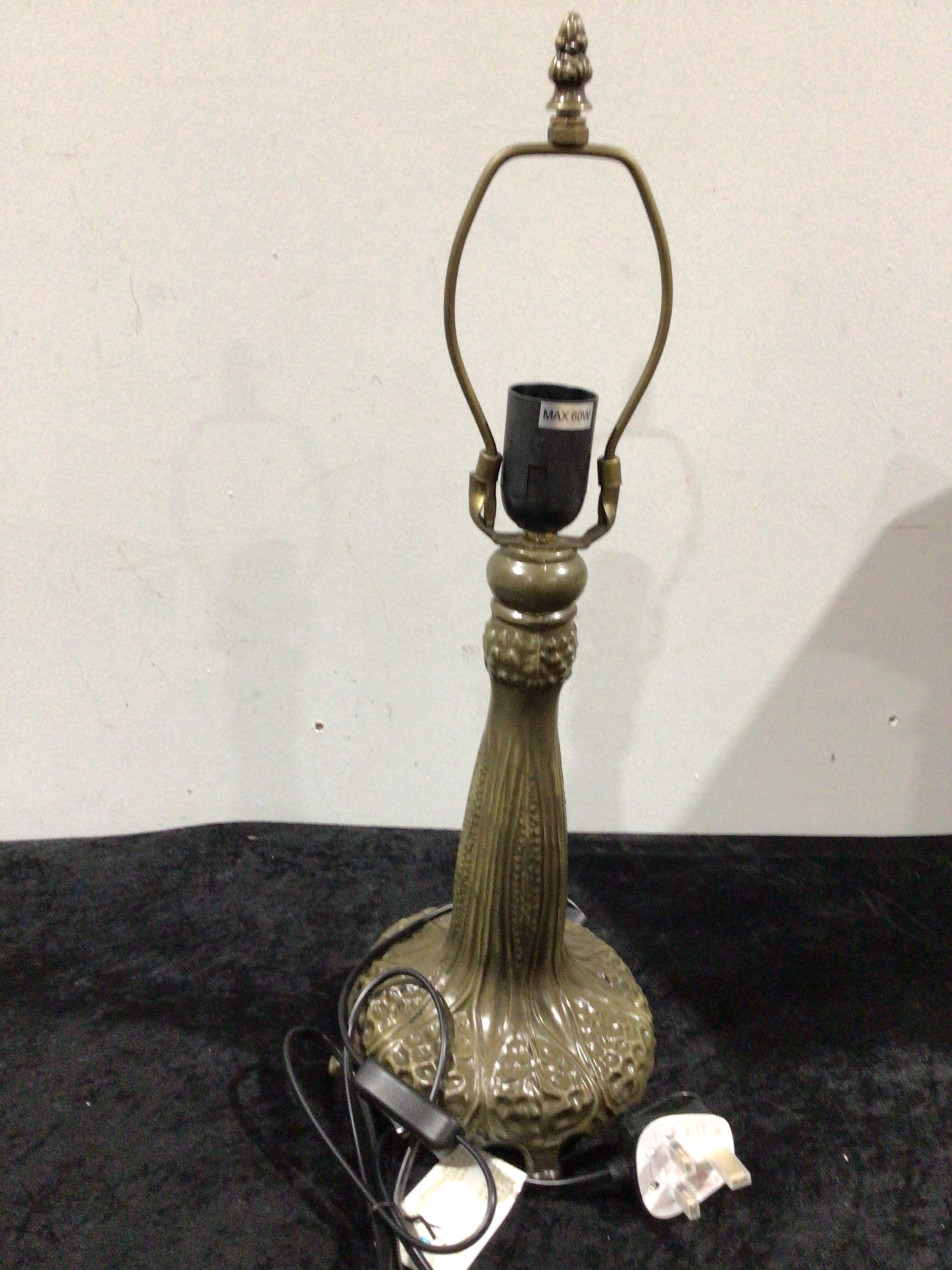 A decorative table lamp bases, likely constructed from cast metal with an aged bronze or brass-toned patina, exhibiting an organic, possibly Art Nouveau or Arts and Crafts inspired style. Each base features a fluted or bundled stalk-like shaft tapering upwards from a broad, scalloped lower section adorned with raised, possibly foliate or shell-like motifs. A brass-toned harp assembly supports a black plastic lamp socket, marked “MAX 60W” (maximum 60 watts), topped with a decorative, possibly acorn-shaped finial. Each lamp is fitted with a black electrical cord including an in-line switch and a white three-pin UK-style plug.