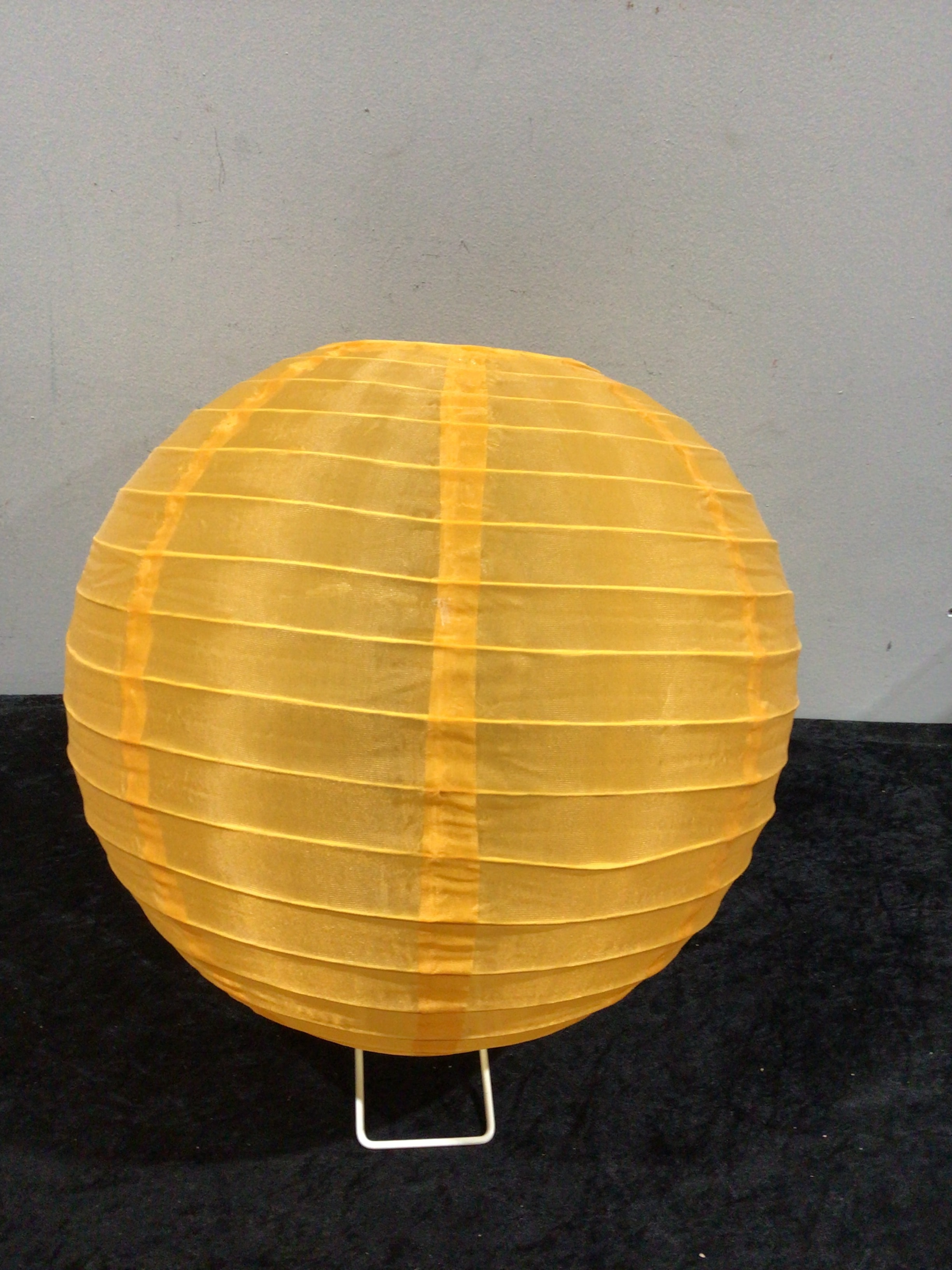 A collection of 60 round, collapsible paper lanterns, each approximately 16 inches in diameter, in a yellow-orange color, supported by a white metal stand.