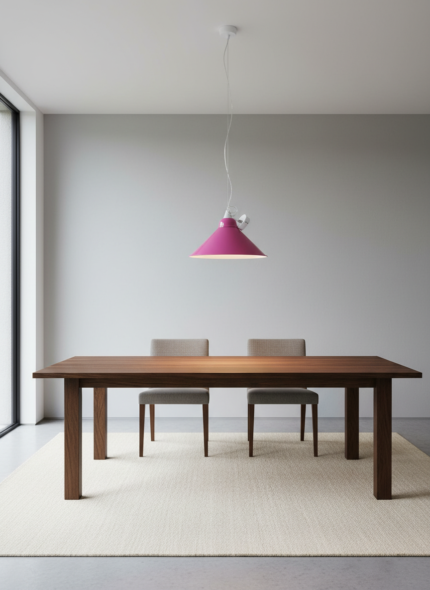 Two bright pink pendant lamp shades with white top fixtures and clear electrical cords.