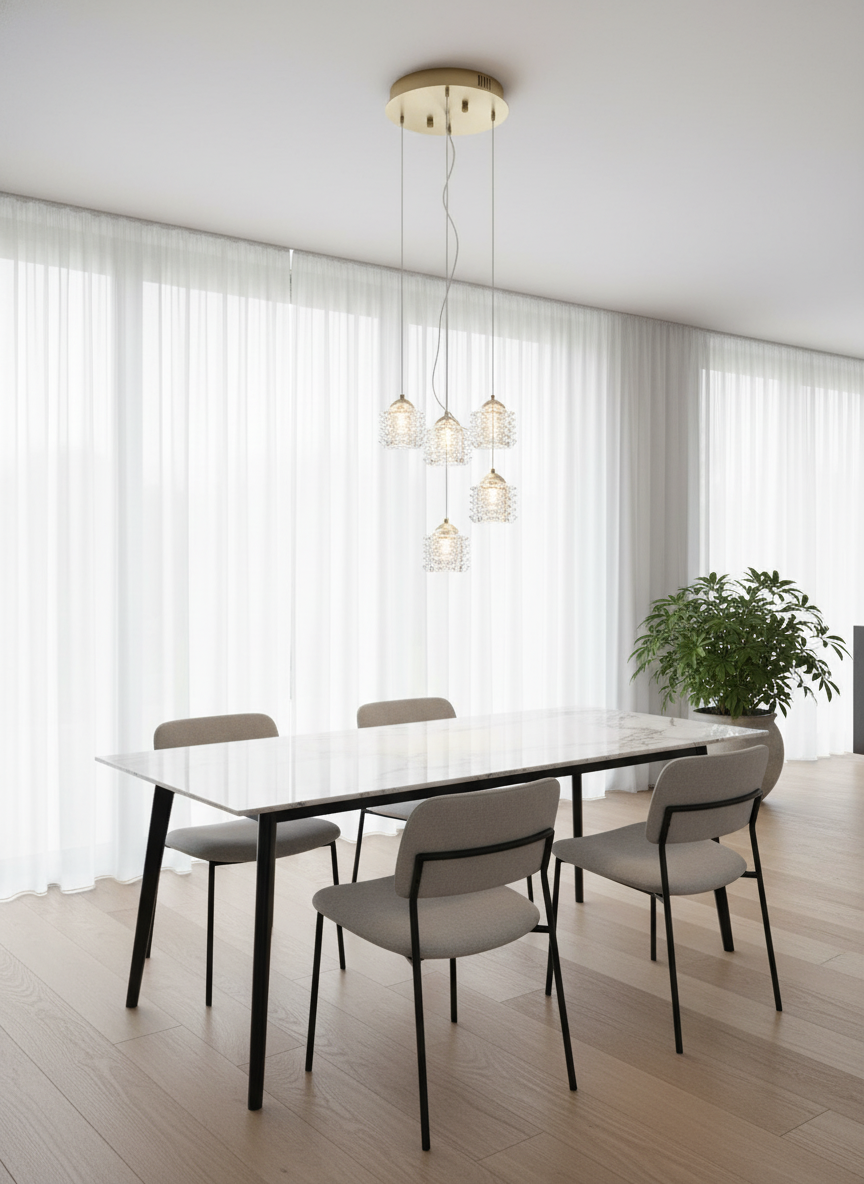 A brass coloured ceiling light fixture with six clear glass shades