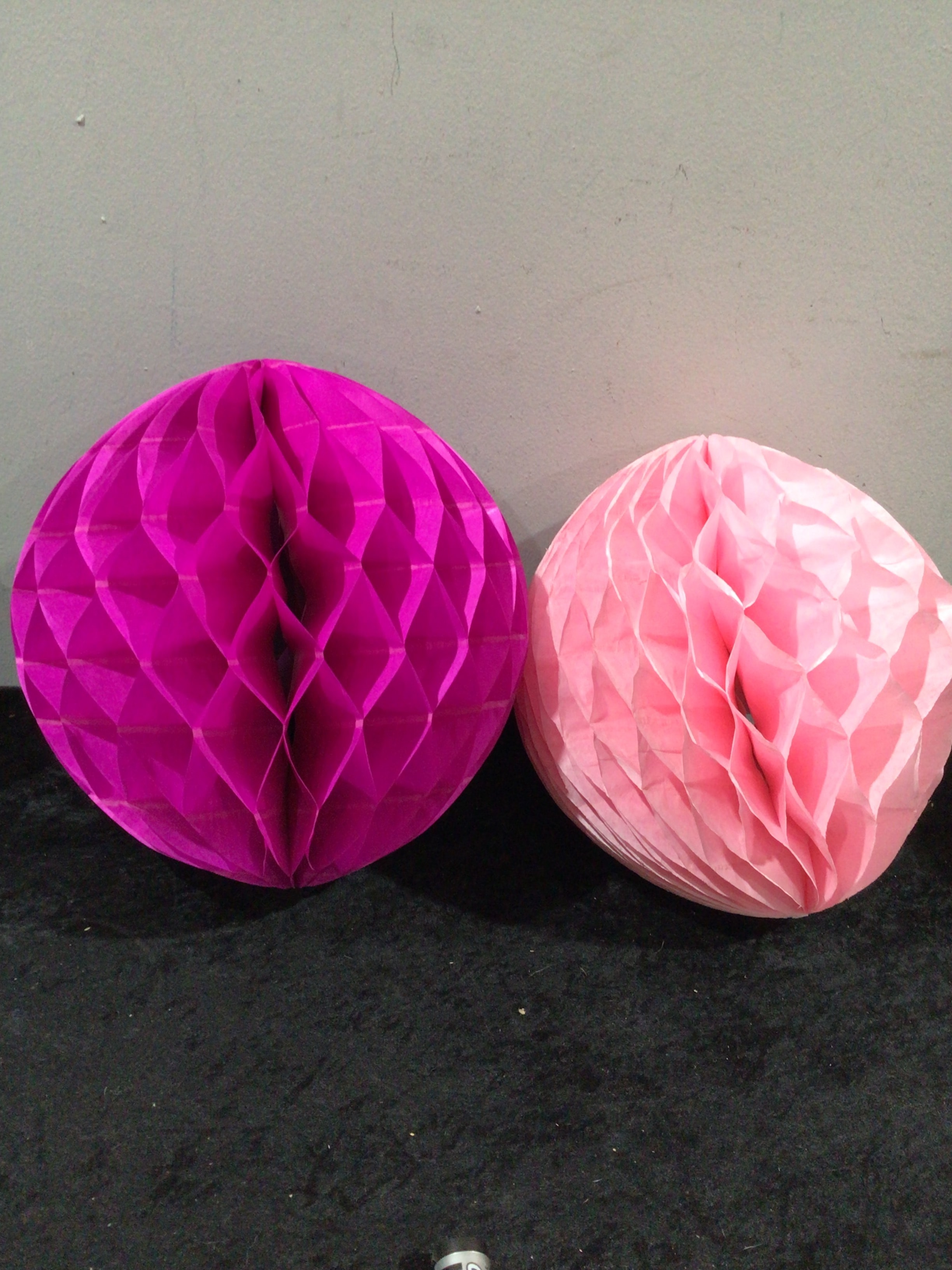 box of  honeycomb decorations, one fuchsia and one light pink.