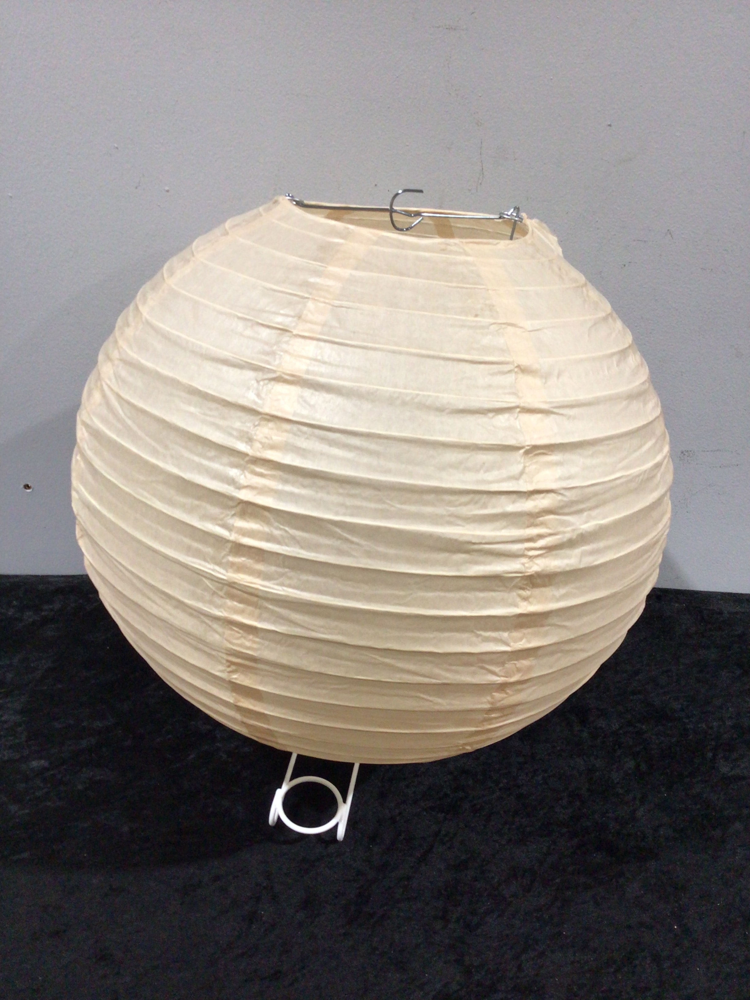 A lot of 46 spherical beige/cream paper lanterns, approximately 14 inches, with even ribbing, suitable for hanging decoration.