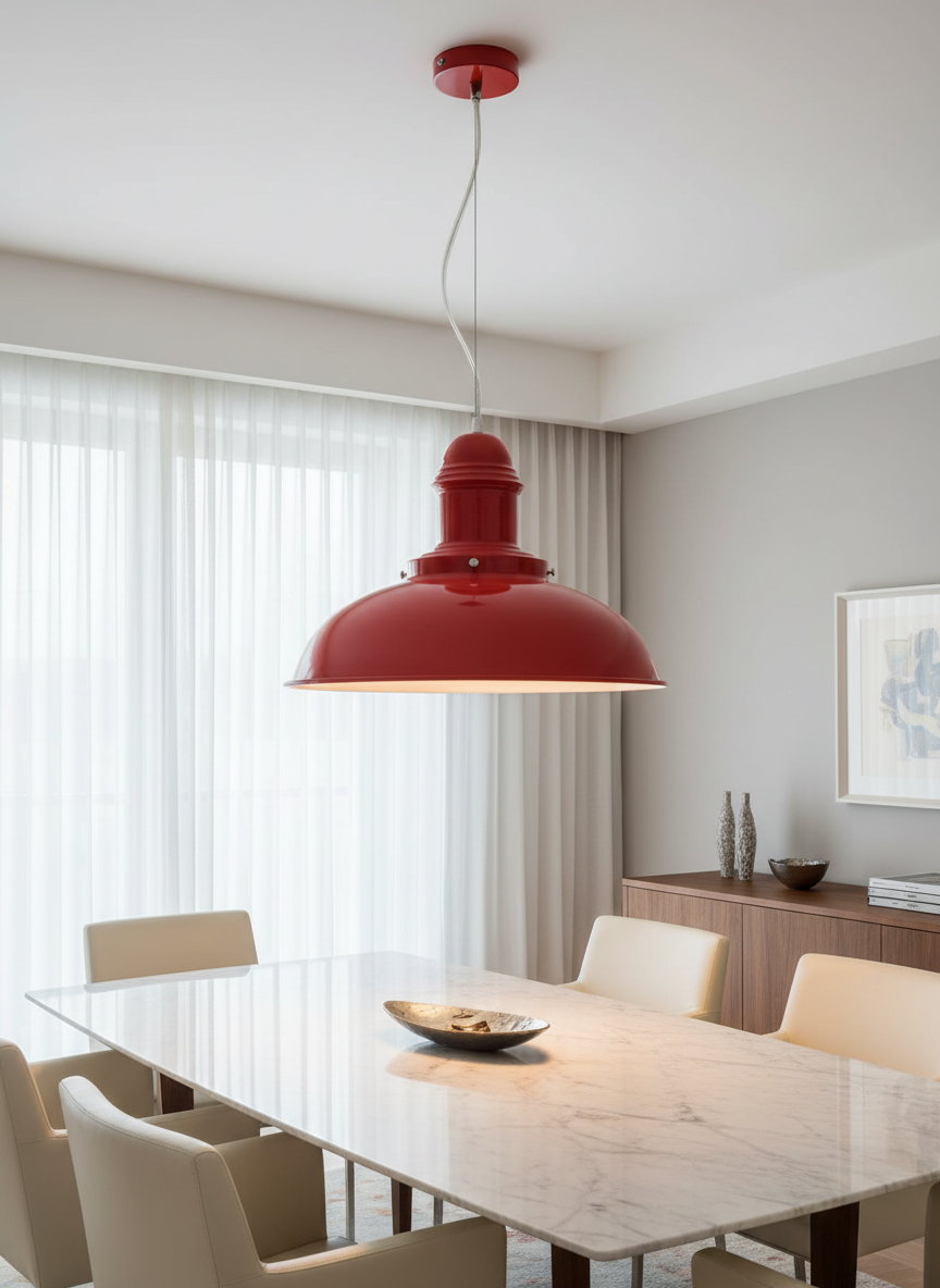 A pair of bright red industrial-style pendant light fixtures with clear/silver electrical cords.