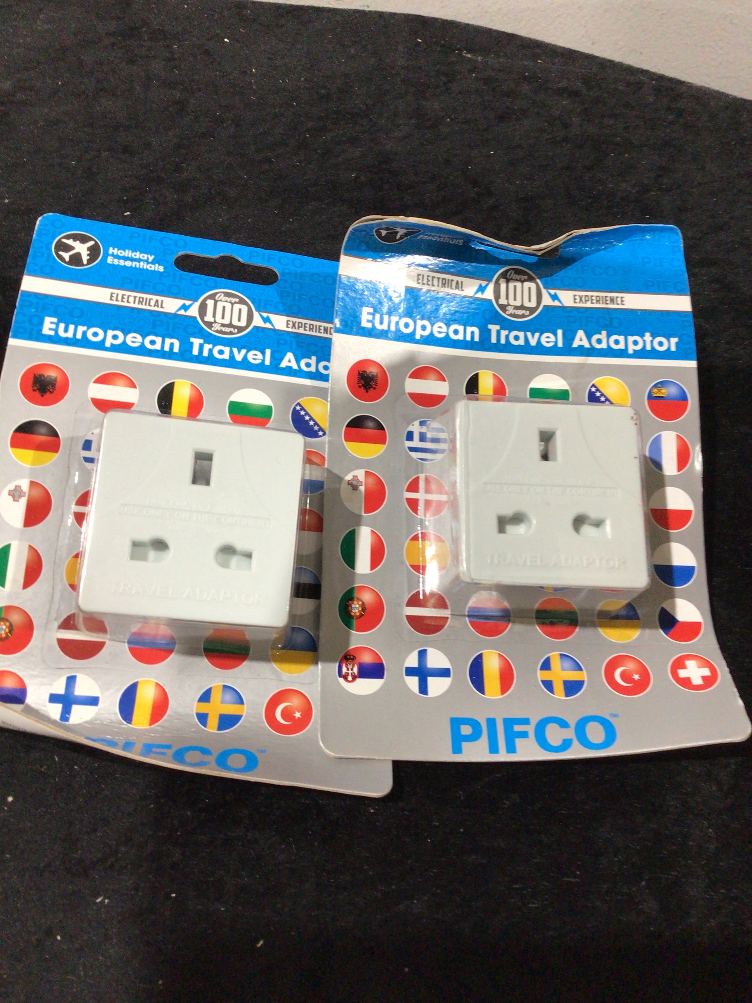 A lot of 40 new, packaged PIFCO European Travel Adaptors, light grey/white, in blue, grey, and white packaging featuring European country flags and “ELECTRICAL”, “Over 100 Years EXPERIENCE”, and “Holiday Essentials” text.