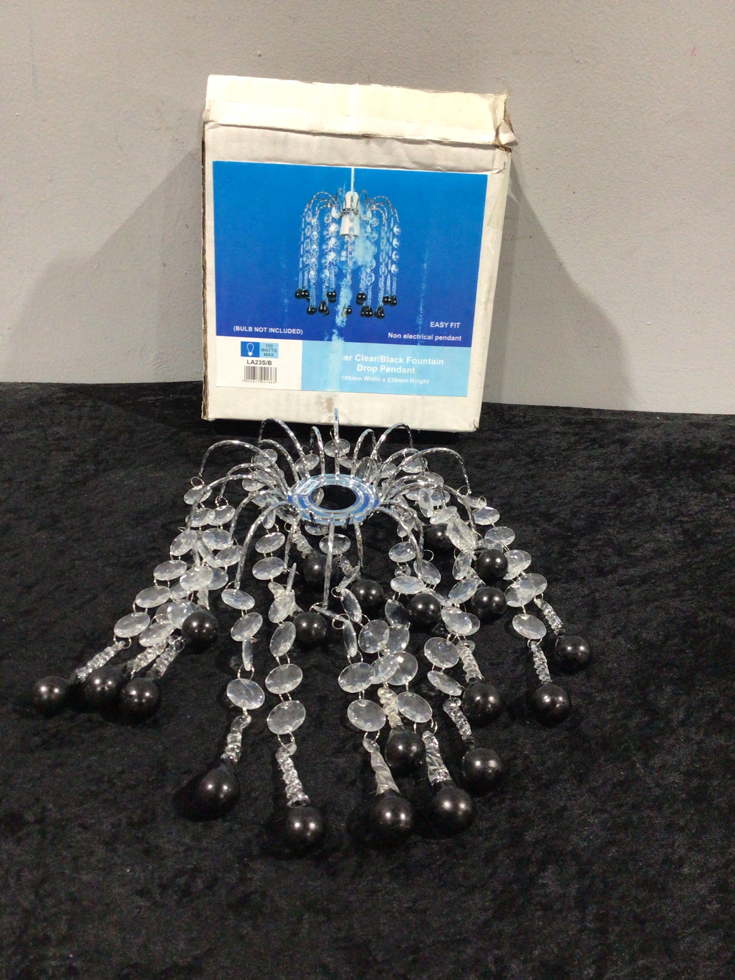 A set of four Clear/Black Fountain Drop Pendants with clear crystal-like and black spherical drops, accompanied by their white and blue packaging boxes labeled ‘EASY FIT,’ ‘Non electrical pendant,’ ‘BULB NOT INCLUDED),’ ‘100 WATTS MAX,’ and ‘LA23S/B,’ with each pendant measuring 190mm Width x 230mm Height.