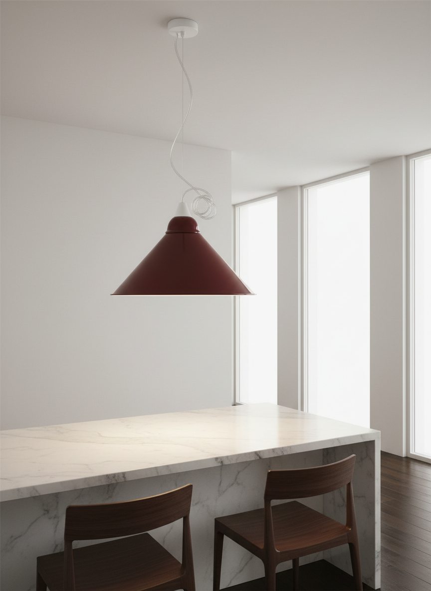 A glossy dark red metal ceiling pendant light shade with a white plastic fitting and clear electrical cable.