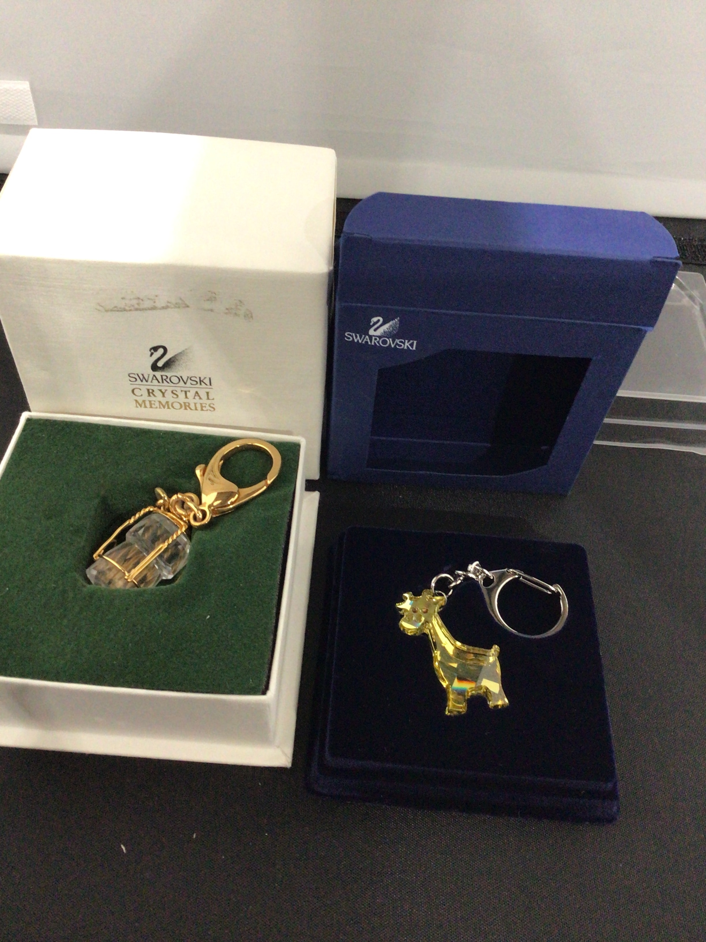 This lot comprises two modern decorative crystal keychains, each presented with its original branded packaging. The first keychain features a clear, faceted crystal charm shaped like a champagne bottle, set in gold-tone metal hardware. It is housed in a white cardboard box with a green felt interior, marked “SWAROVSKI CRYSTAL MEMORIES” and the brand’s swan logo. The second keychain consists of a yellowish-golden faceted crystal charm, stylized as an animal, attached to silver-tone metal hardware. This item is displayed on a dark blue velvet insert, adjacent to a blue cardboard box visible with “SWAROVSKI” and its swan logo.