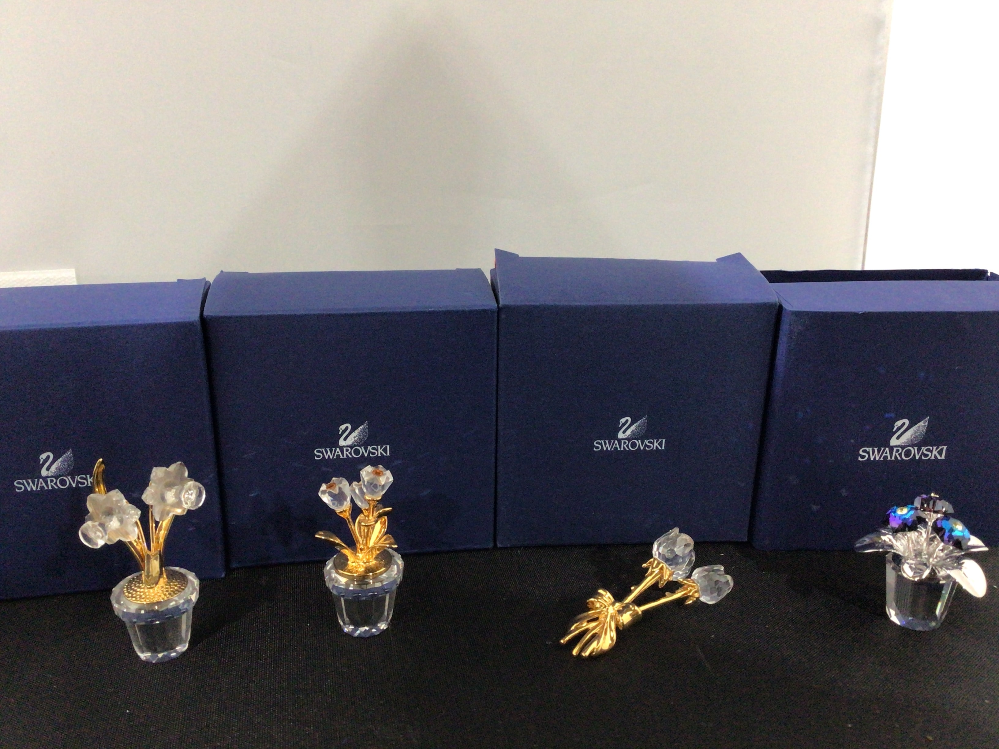 A group of four Swarovski crystal floral figurines. Each features a floral motif. Three pieces consist of clear faceted crystal flowers with either gold-tone or silver-tone stems and foliage, set within small faceted crystal pots; one of these potted arrangements includes iridescent blue and purple accents. The fourth figurine depicts two clear faceted crystal flowers with gold-tone stems tied with a gold-tone bow, laid horizontally. All items are accompanied by four dark blue original presentation boxes, each clearly marked with the “SWAROVSKI” brand name and swan logo in white.