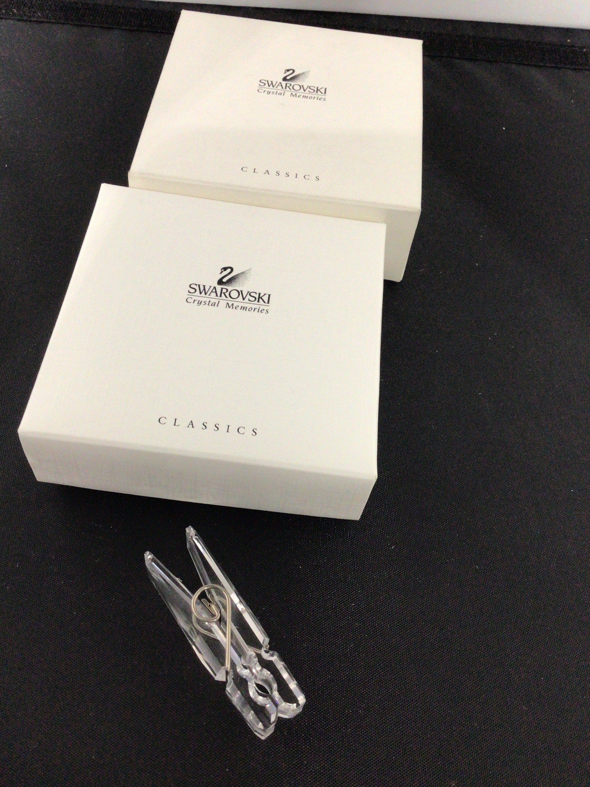 A Swarovski Crystal Memories ‘Paper Clip Clothes Pin’, model 265819, from the Classics line. This miniature clothespin is crafted from faceted clear crystal and features a silver-tone wire spring mechanism. It is presented with two original white cardboard boxes, each printed with the ‘SWAROVSKI Crystal Memories’ logo and ‘CLASSICS’ text.