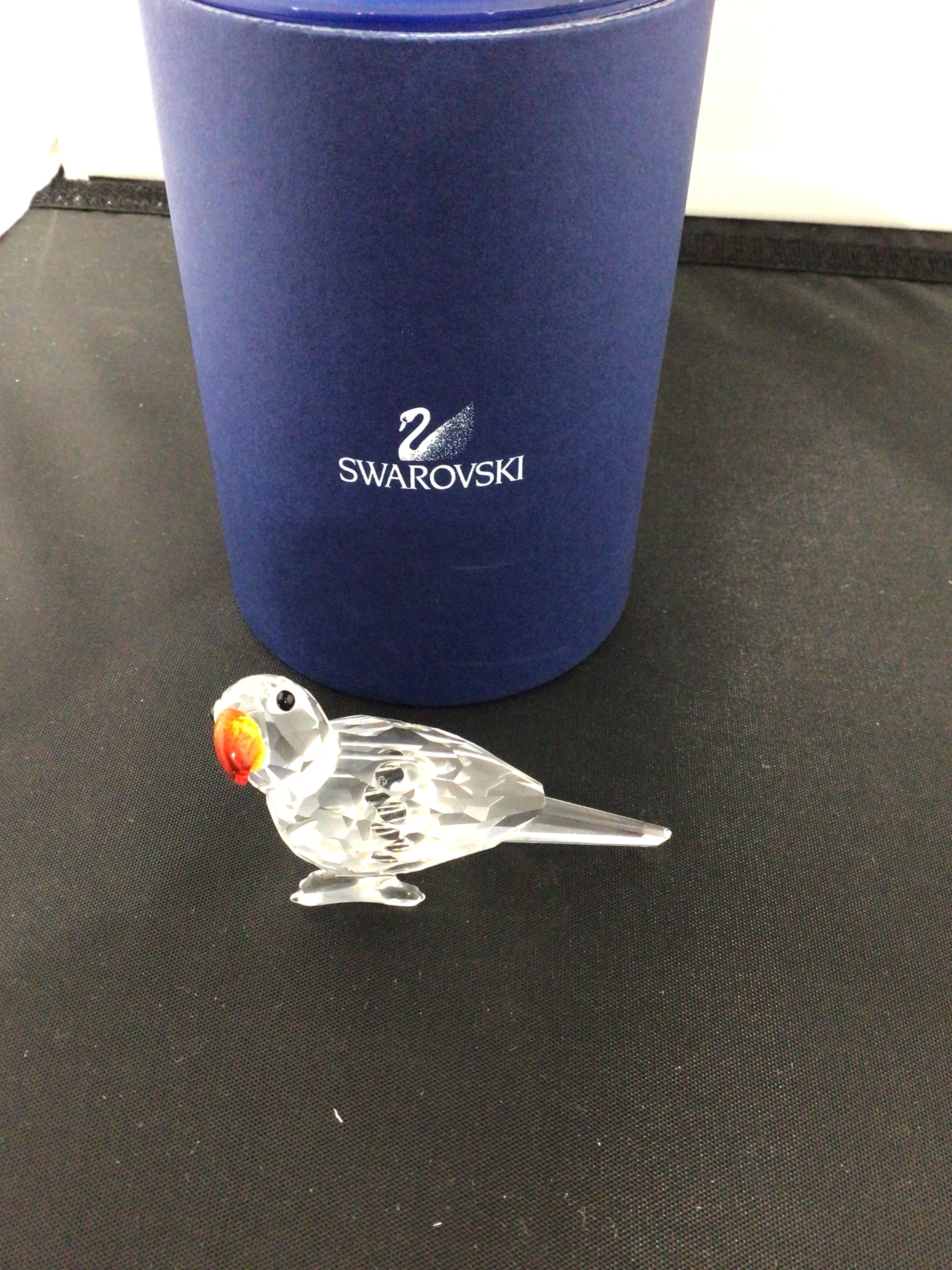 A Swarovski crystal bird figurine, depicting a faceted clear crystal bird, specifically resembling a parrot or lovebird, with black eyes and a distinctive orange-red beak. The figurine rests on a small integrated clear crystal base. It is accompanied by its original dark blue cylindrical box, which bears the white swan logo and the word “SWAROVSKI” printed on its side.