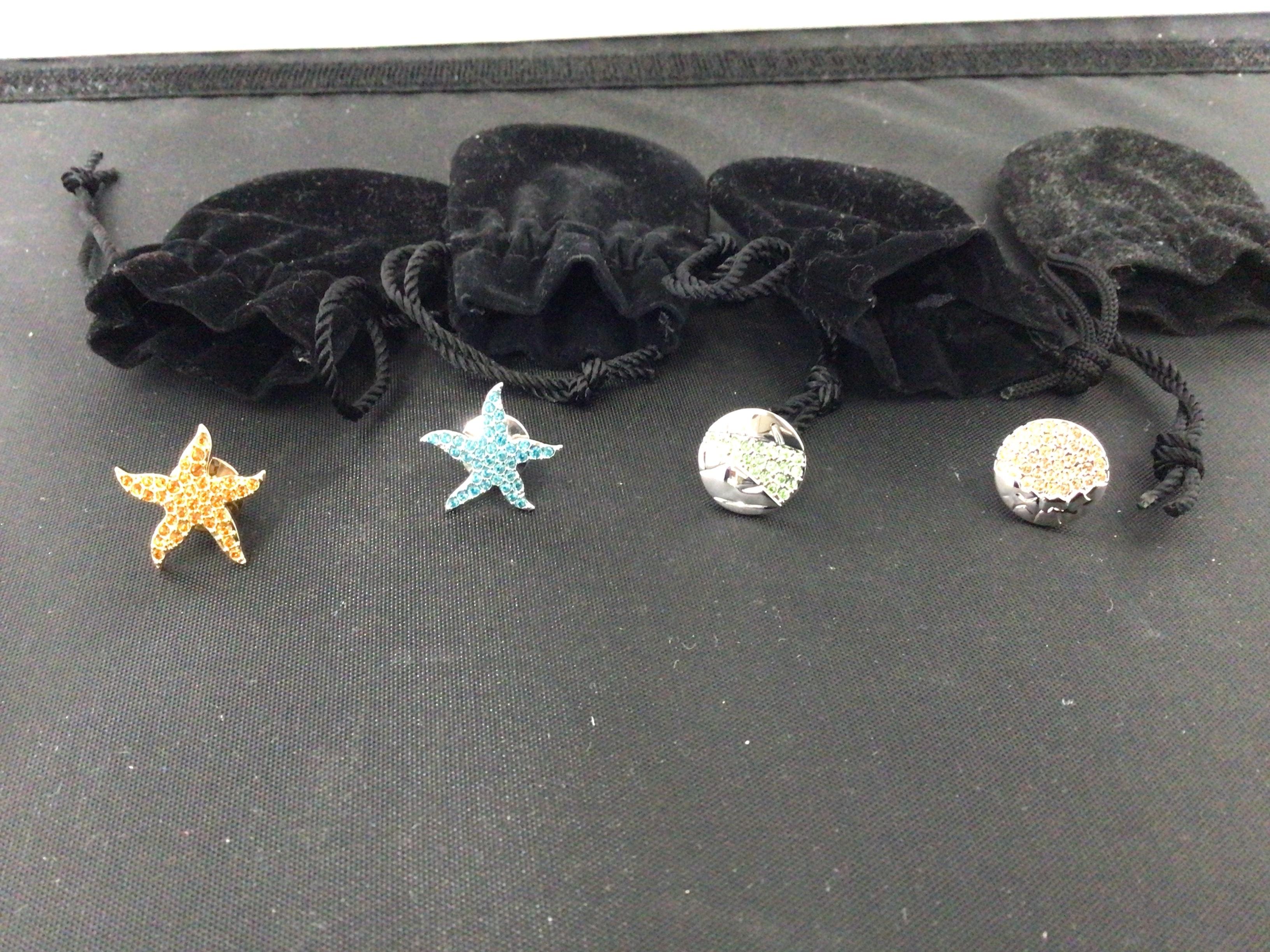 A group of four Swarovski pins, including two starfish-shaped pins and two domed circular pins. The starfish pins are set with numerous small crystals, one in amber-colored stones (consistent with ‘Jonquil’ as seen in web research for SCS 2007 models) and the other in light blue stones. The two circular domed pins feature a textured or cutout side design and are covered in small crystals, one with light green stones and the other with clear or light yellow stones. All pins are crafted from a silver-tone metal, likely set with rhinestones or crystals. The starfish pins are consistent with Swarovski SCS 2007 ‘Tie Tac Style Brooch’ models. The pins are accompanied by four black velvet drawstring pouches. No visible text or markings are apparent on the pins.
