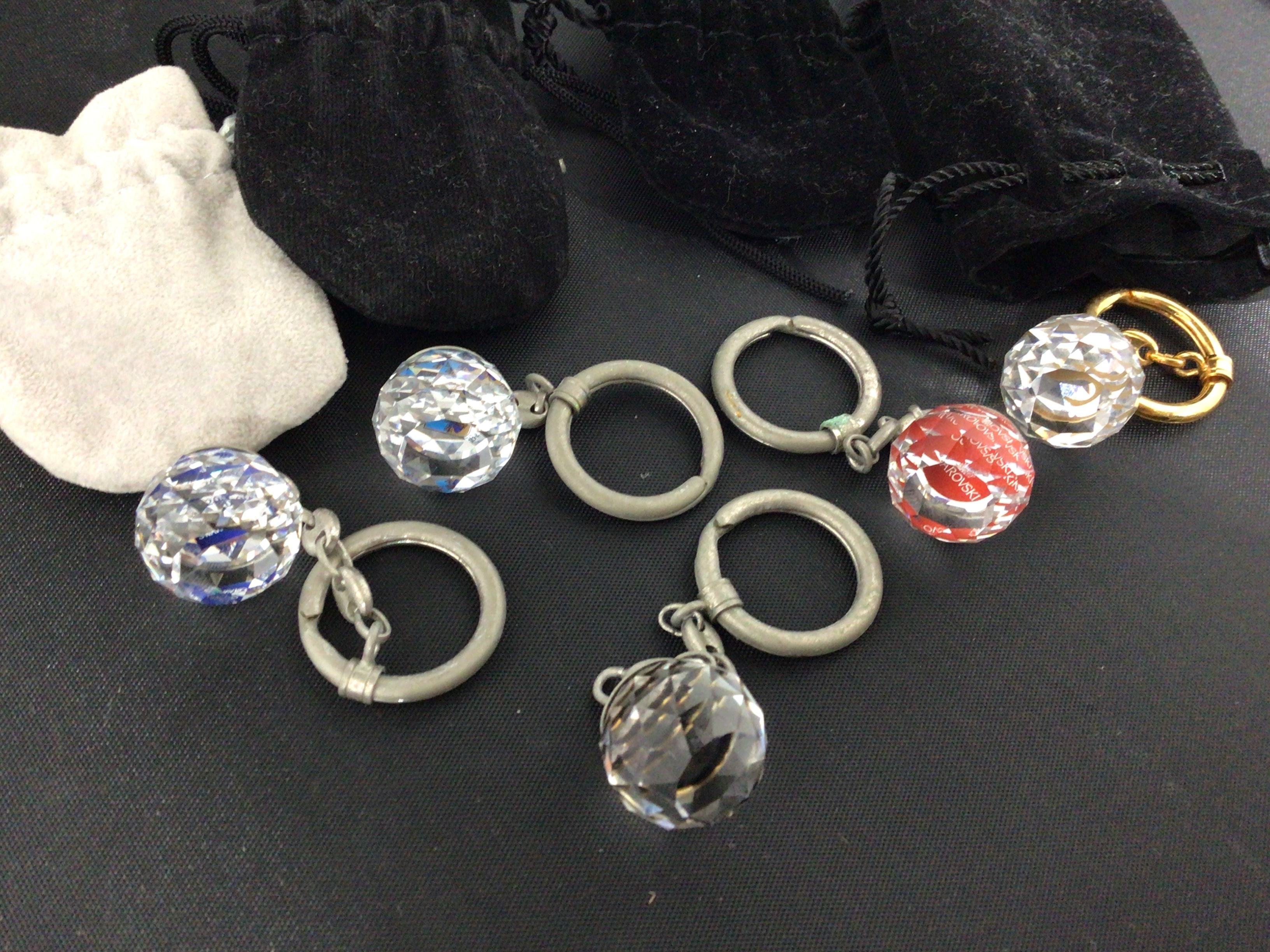 A group of Swarovski Crystal Ball Keyrings, comprising six keychains and three fabric drawstring pouches. The keychains feature faceted crystal spheres, with five having silver-tone metal rings and one featuring a gold-tone metal hinged clasp. The crystal spheres vary in color, including clear, blue-tinted, red-backed, and dark grey. The brand name “SWAROVSKI” is visibly marked in white lettering on the red-backed crystal and appears faintly on other clear spheres. The accompanying pouches, one off-white and two black, are constructed from a soft, velvet-like material.