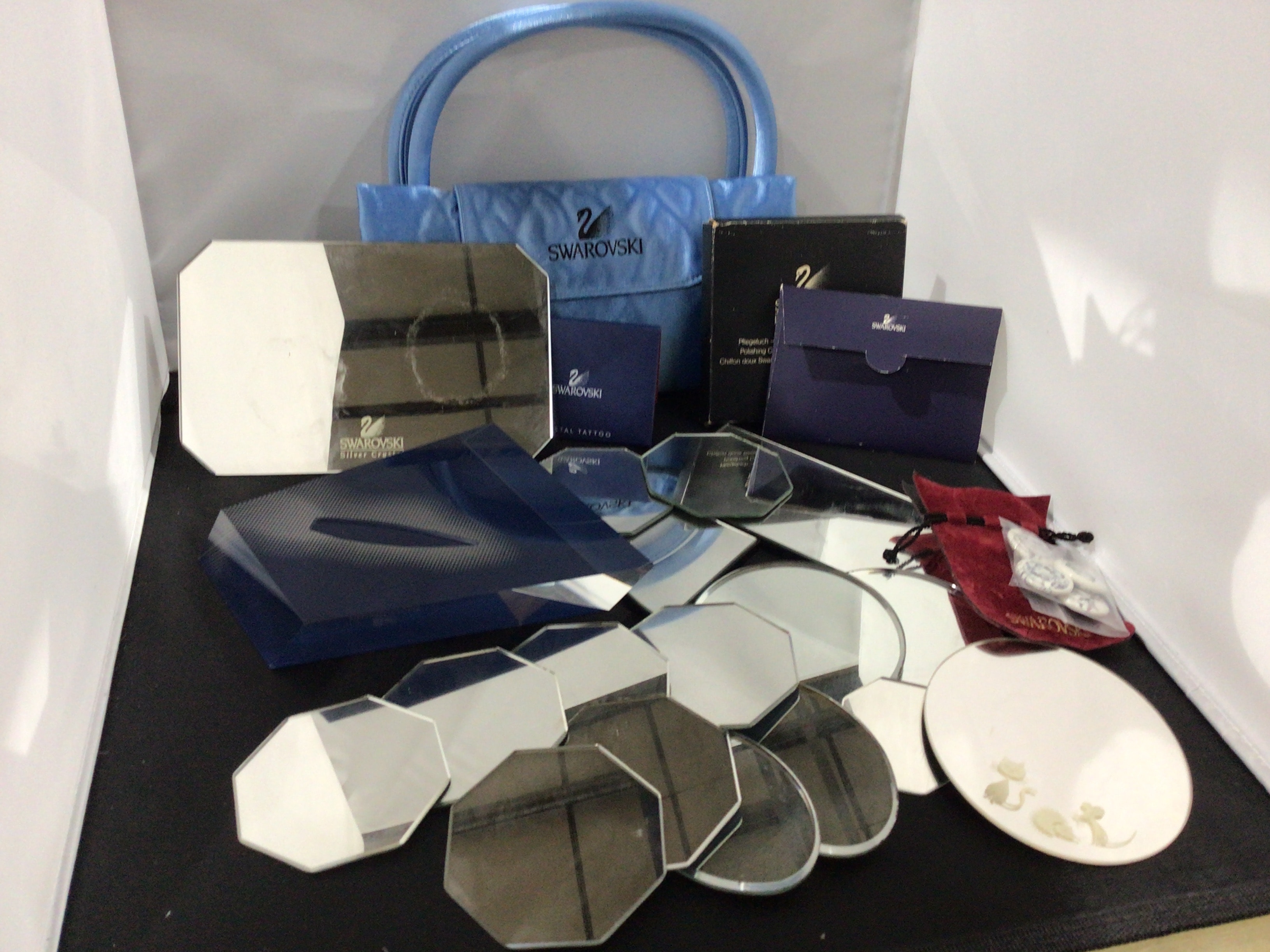 A collection of Swarovski branded merchandise and accessories. The lot includes a light blue fabric carry bag featuring the Swarovski logo, and various cardboard packaging, with boxes marked “SWAROVSKI Silver Crest” and “CRYSTAL TATTOO”. Also present is a dark blue envelope-style holder, partially inscribed “Pflegetuch”, “Polishing C”, and “Chiffon doux Swa”, indicating a care cloth. The main group comprises numerous small glass mirrors in assorted hexagonal, teardrop, and oval shapes. One oval mirror is notable for displaying etched or printed designs of two cats and a mouse. Additionally, a red velvet drawstring pouch contains several small, white, circular objects encased in a clear plastic bag.