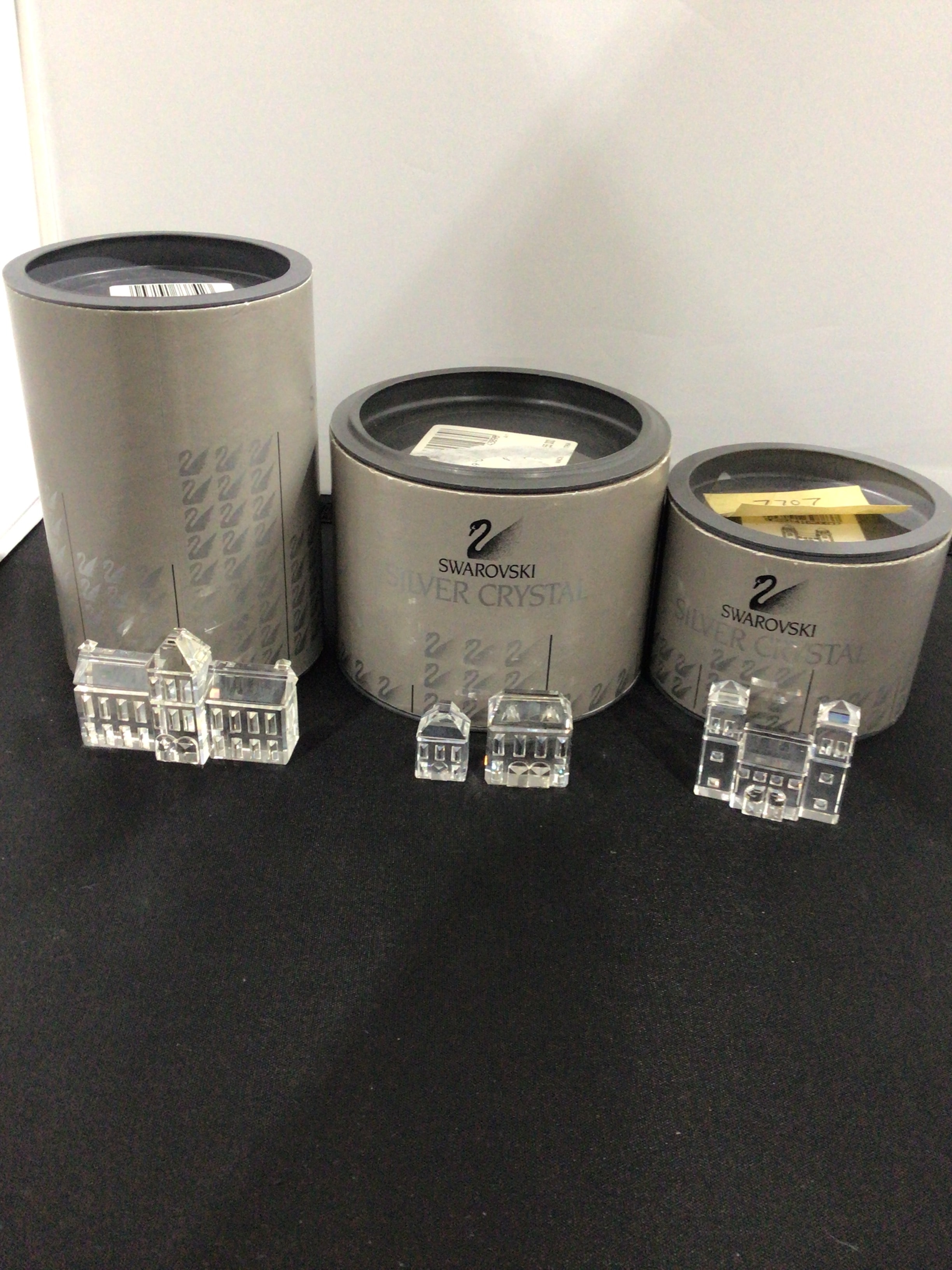Swarovski Silver Crystal Group of Miniature Building Figurines with Three Presentation Boxes