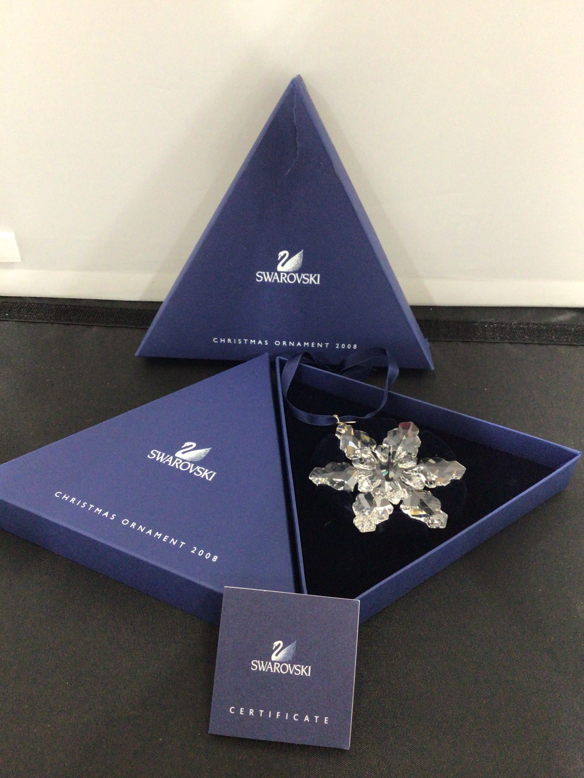 A Swarovski Annual Edition 2008 Christmas Snowflake Ornament. Comprising a clear, multi-faceted Swarovski crystal Christmas ornament, designed in the shape of a snowflake, suspended by a dark blue ribbon with a metal ring. It is presented within its original two-part triangular deep blue cardboard box, lined with a dark blue velvet interior. Both sections of the box are marked with the ‘SWAROVSKI’ swan logo and text, accompanied by ‘CHRISTMAS ORNAMENT 2008.’ A small rectangular certificate card, also featuring the Swarovski logo and ‘CERTIFICATE,’ is included.