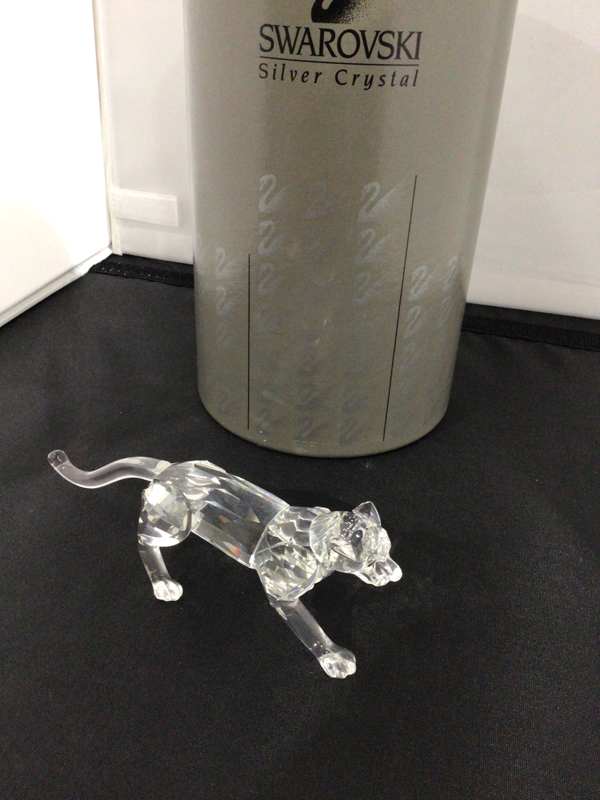 A Swarovski Silver Crystal ‘Leopard’ figure, model number 217093. This faceted clear crystal figurine depicts a crouching or walking feline. The piece is marked with the “SWAROVSKI” and “Silver Crystal” text, along with multiple faint swan logos, consistent with the brand’s modern decorative crystal production.