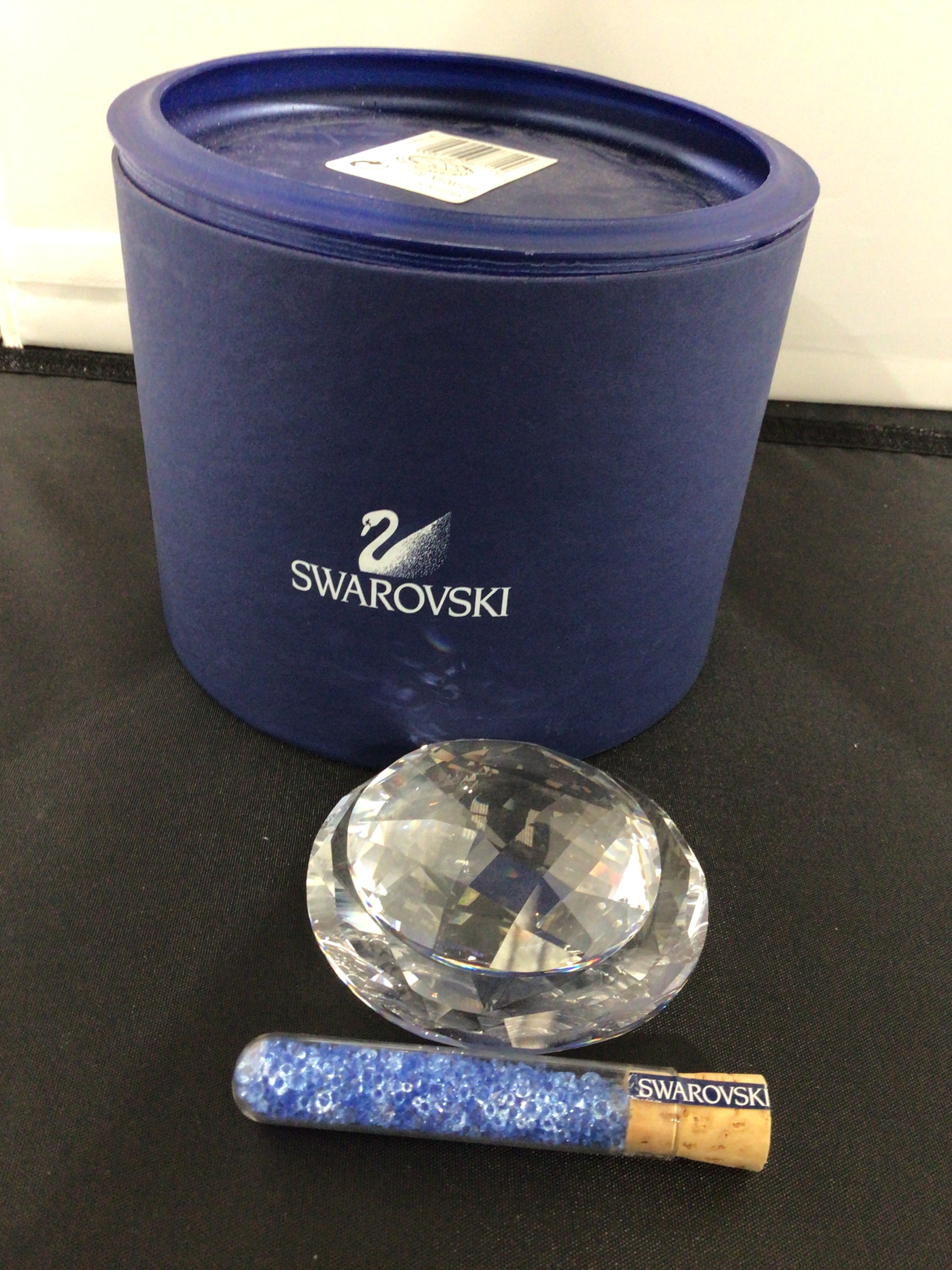 A Swarovski SCS 2005 Tropical Jewelry Box, comprising a cylindrical dark blue cardboard box with a removable lid, featuring the white Swarovski swan logo and ‘SWAROVSKI’ text, along with a barcode sticker. Contained within is a clear, highly faceted crystal object of ovoid or cushion shape, displaying multiple geometric cuts. Also included is a small, clear glass vial, sealed with a cork stopper, containing numerous tiny, translucent blue beads, with a blue band around the cork marked ‘SWAROVSKI’ in white text.