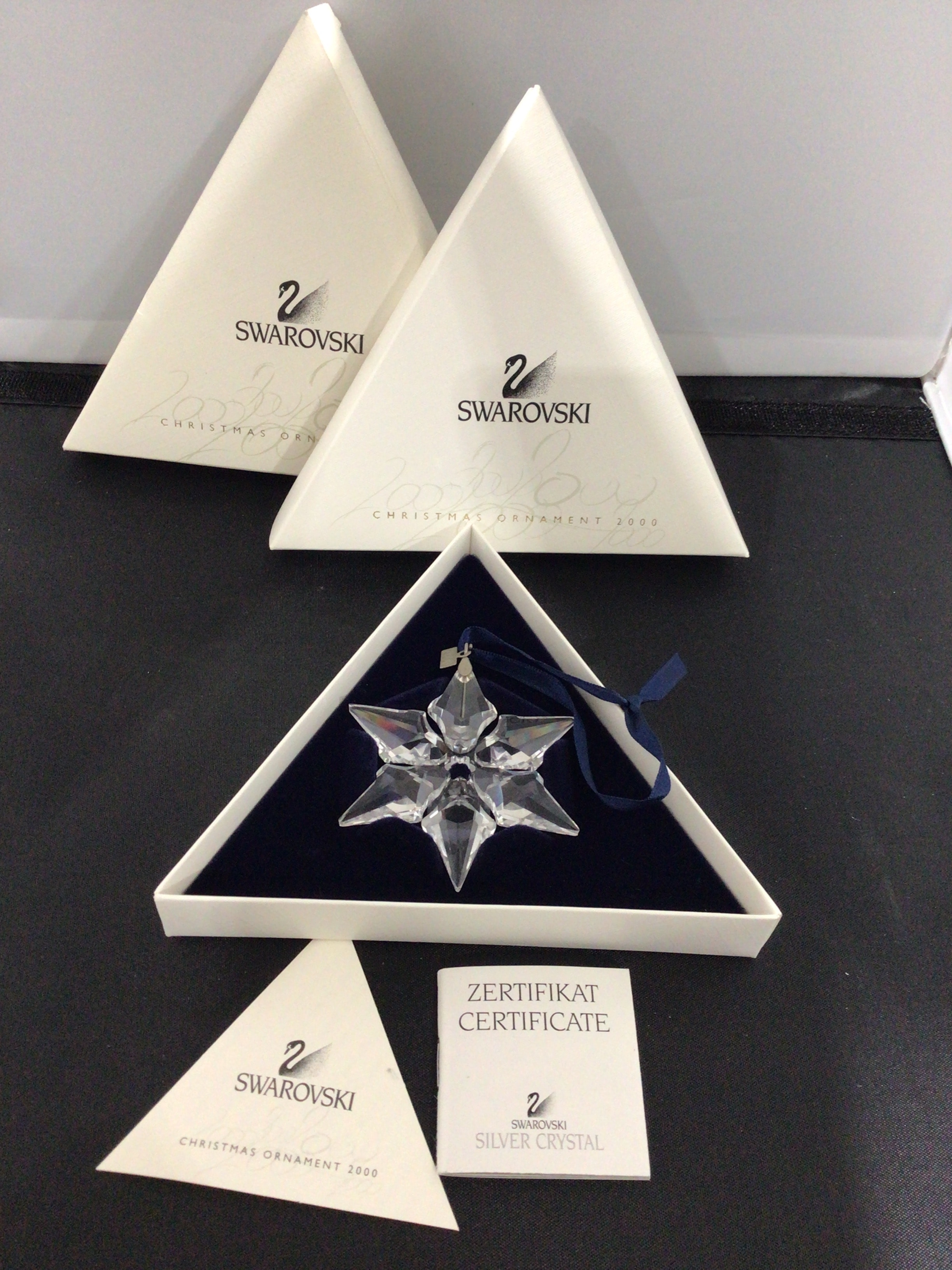 A Swarovski Annual 2000 Christmas Ornament, crafted from clear faceted crystal in a six-pointed star shape. The ornament is suspended by a dark blue ribbon. It is presented in its original white triangular presentation box with a navy velvet interior, accompanied by two additional triangular outer boxes and a “Zertifikat Certificate” booklet. All packaging and the booklet bear the “Swarovski” swan logo and “Christmas Ornament 2000” text, with the booklet also noting “Silver Crystal”.