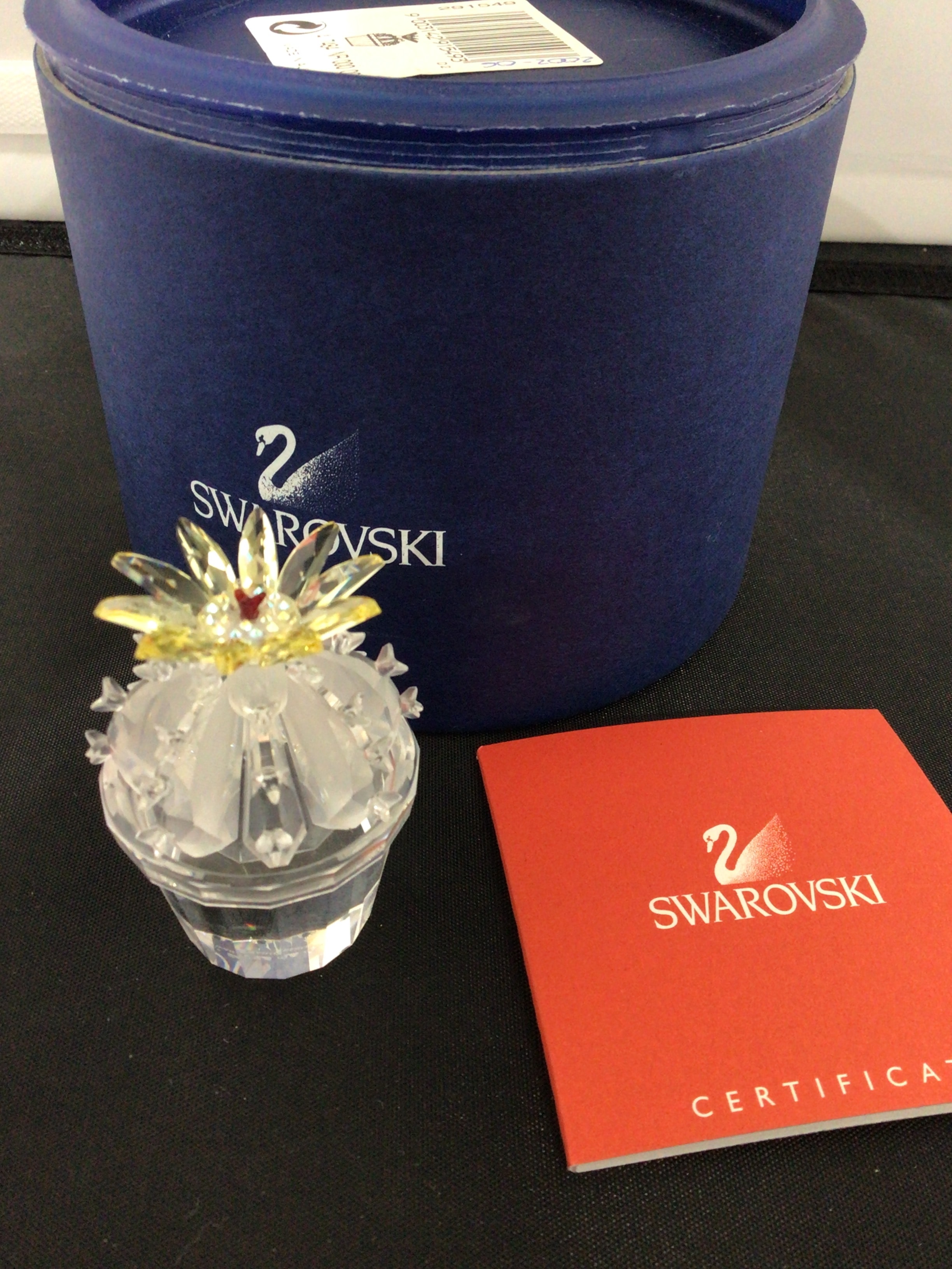 A Swarovski Crystal Flowering Cactus Figurine. This modern faceted crystal figurine features clear petals, a gold-tone pistil, and a central red accent, set upon a clear, faceted base. It is accompanied by its original cylindrical dark blue packaging box, branded with the ‘SWAROVSKI’ logo and swan graphic. The box bears a barcode label displaying the number ‘291049’ and ‘2002-OG’. Also included is a small red booklet, similarly branded ‘SWAROVSKI’ with partially visible text ‘CERTIFICAT’.