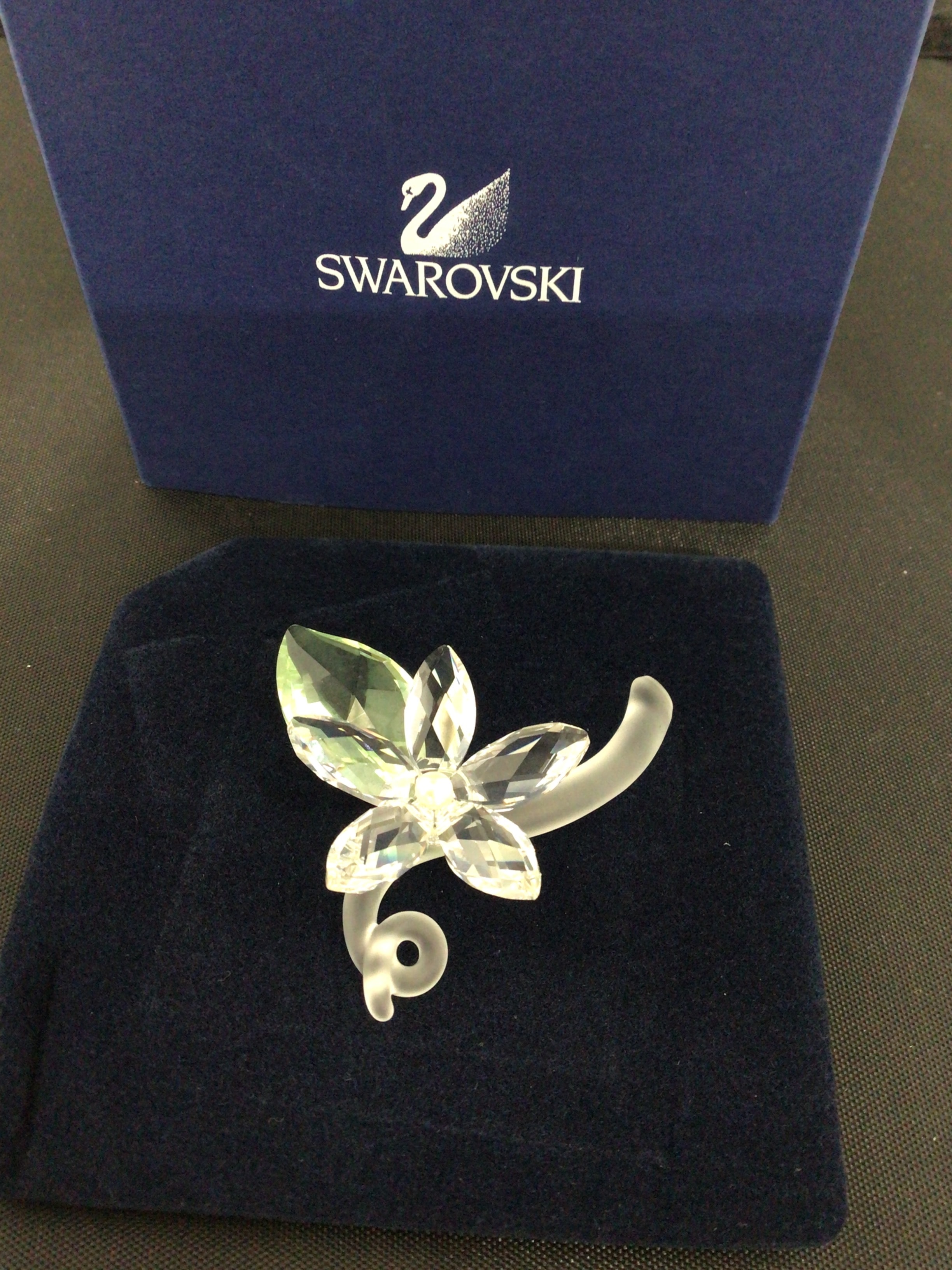 A Swarovski Crystal Jasmine Blossom figurine. The piece features a central arrangement of clear, faceted crystal elements forming the blossom, with a translucent green faceted crystal accent representing a leaf. A frosted, curved crystal component forms the stem or vine. It is presented on a dark blue velvet pouch, with its original dark blue presentation box, clearly marked with the Swarovski swan logo and brand name, visible.