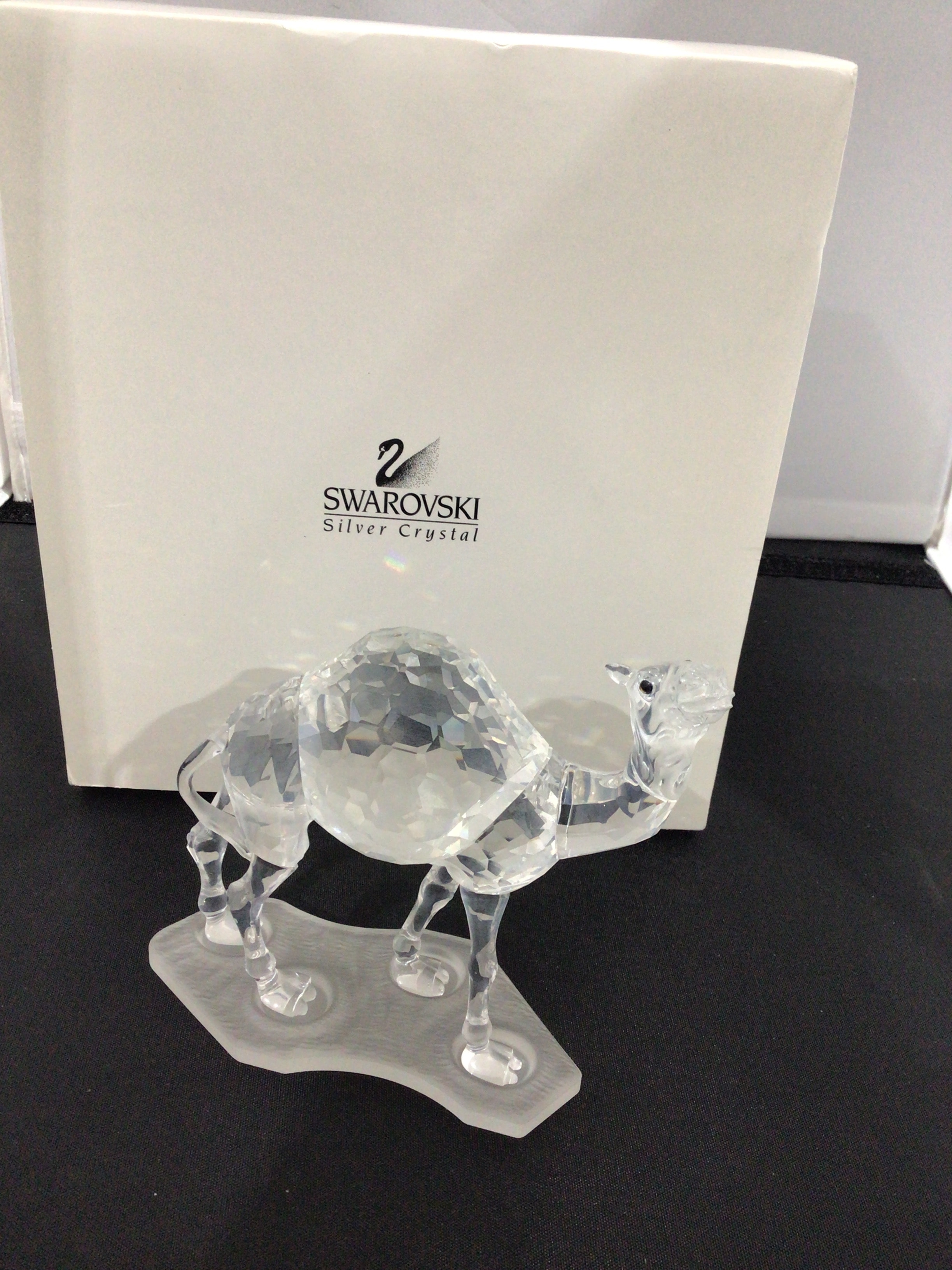 A Swarovski ‘Camel’ figurine, model number 247683, crafted from clear, faceted crystal. The figurine features a multi-faceted body designed to reflect light, with small black accents for the eyes. It stands on a frosted crystal base. The piece is accompanied by its original white box, which is clearly marked with the “SWAROVSKI” brand name, the iconic swan logo, and the English text “Silver Crystal.”